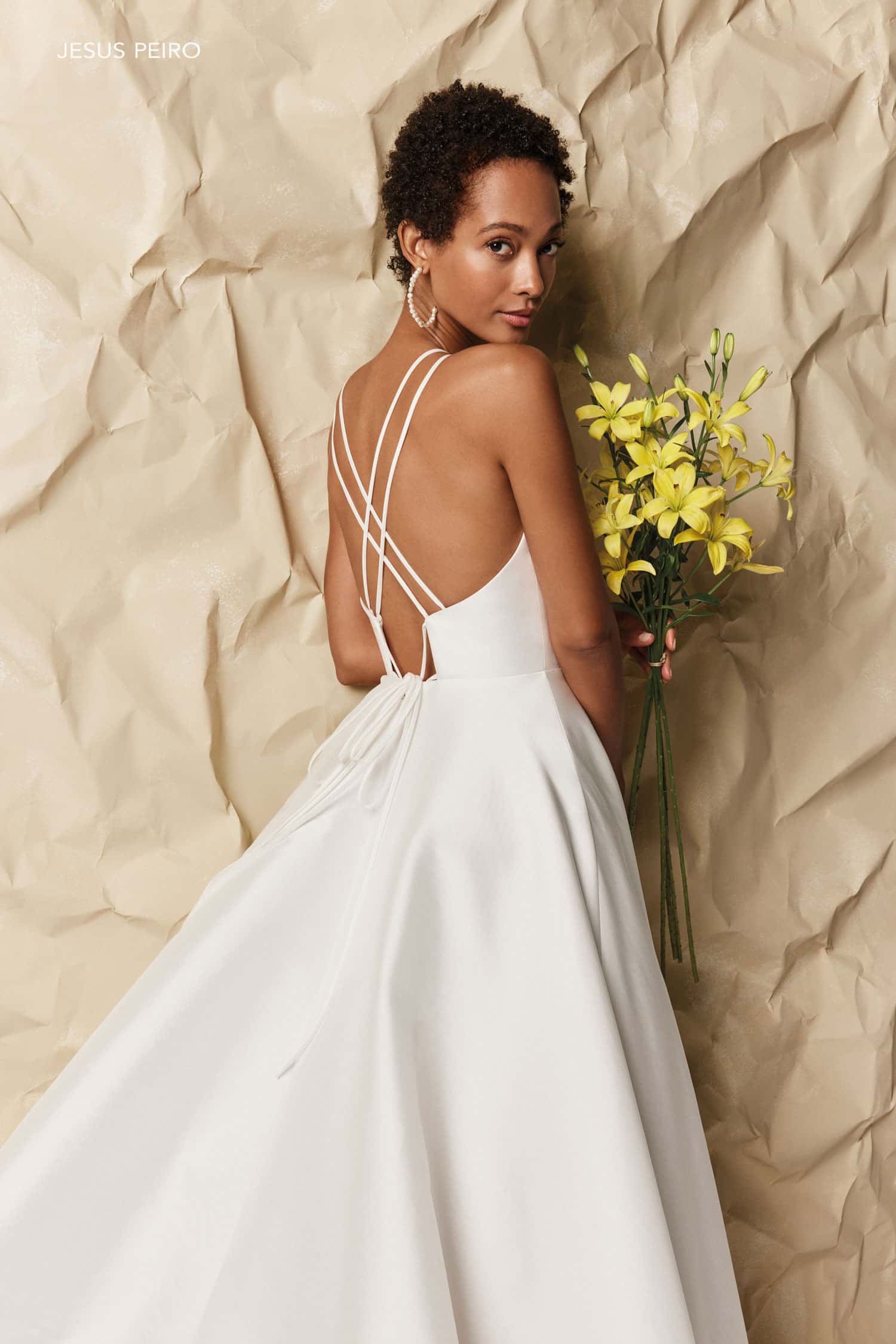 Latzkleid aus Mikadotaft mit weit ausgestelltem Rock und überkreuzten Trägern auf dem Rücken.