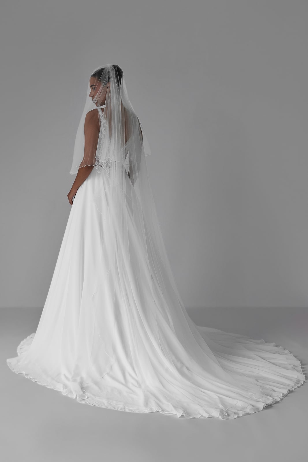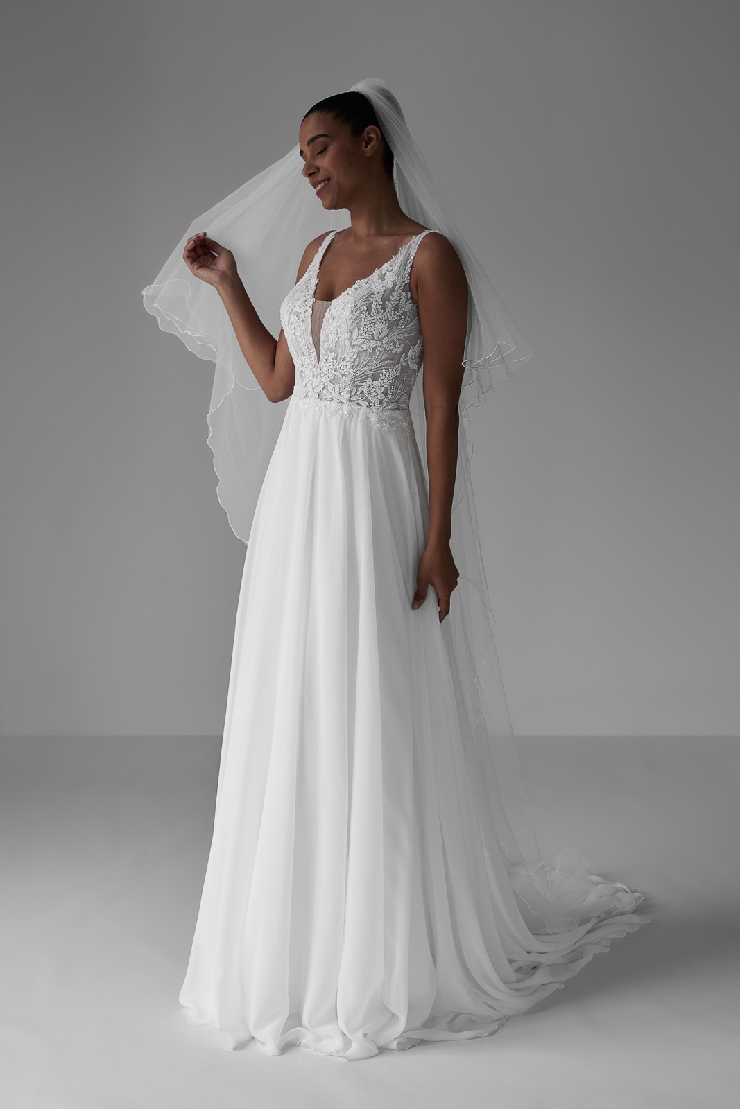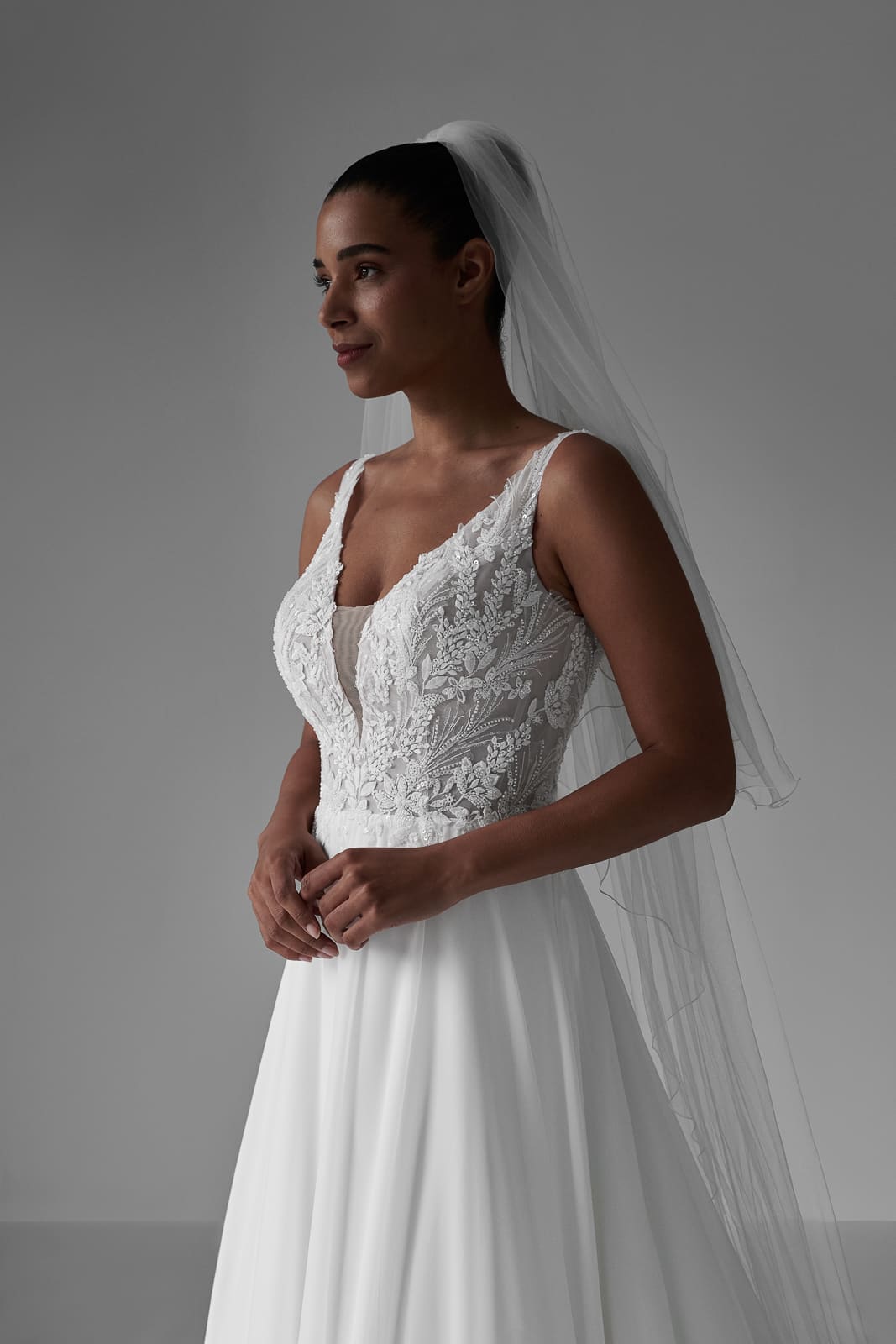 Dieses romantische Brautkleid verzaubert mit einem bestickten Oberteil und tiefem V-Ausschnitt. Der fließende, zarte Chiffonrock verleiht dem Kleid Leichtigkeit und Eleganz, perfekt für den großen Tag. Ein Hauch von Raffinesse trifft auf pure Romantik – für einen unvergesslichen Auftritt.