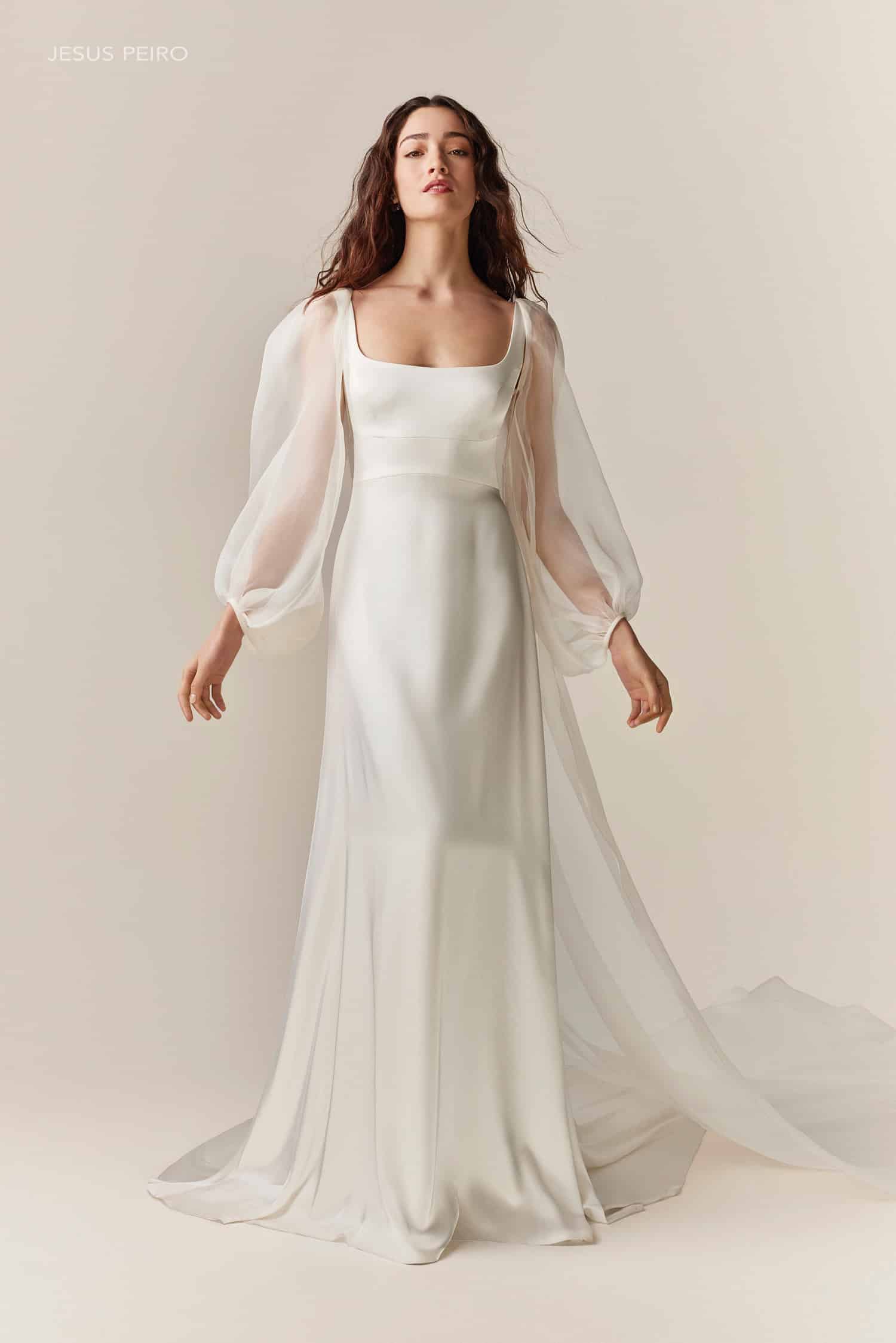 Kombination von Kleid aus Satin mit Cape-Mantel aus Gazar-Seide. Taille mit abgerundeten Nähten auf dem Kleid in einer Linie mit den großen Ärmeln und Passe des Mantels.