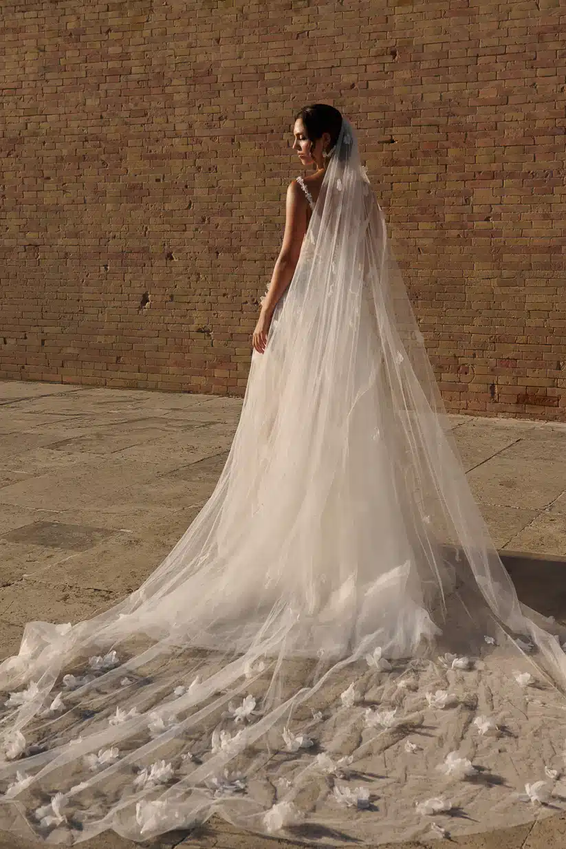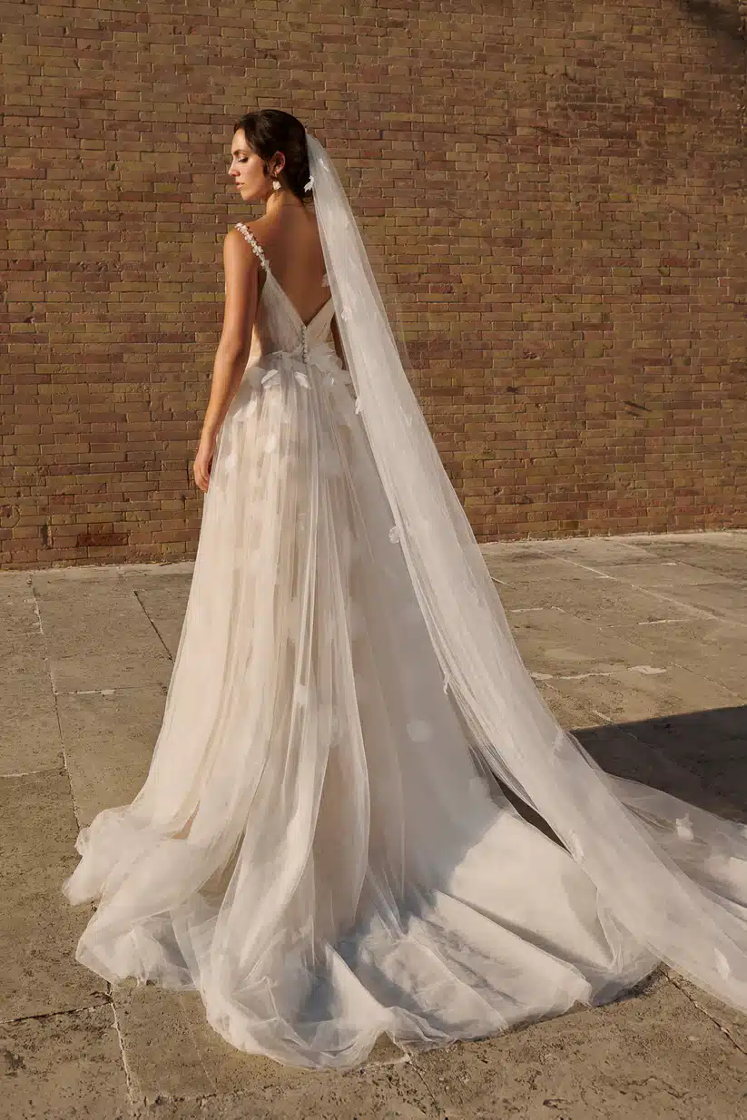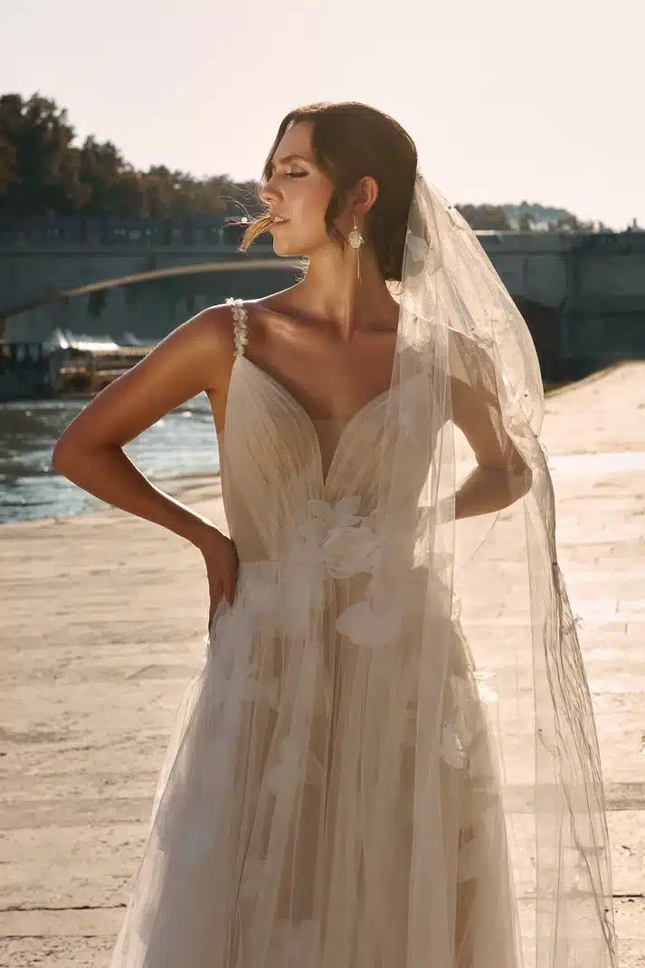26274 verzaubert mit einem feinen, plissierten Tüll-Oberteil und zarten Trägern, die mit floralen 3D-Applikationen geschmückt sind. Der weich fallende Tüllrock ist mit schwebenden Blütenblättern versehen, die bei jeder Bewegung für einen märchenhaften Effekt sorgen. Die betonte Taille und der tiefe V-Ausschnitt zaubern eine elegante, feminine Silhouette – perfekt für Bräute, die Natürlichkeit und Romantik lieben.