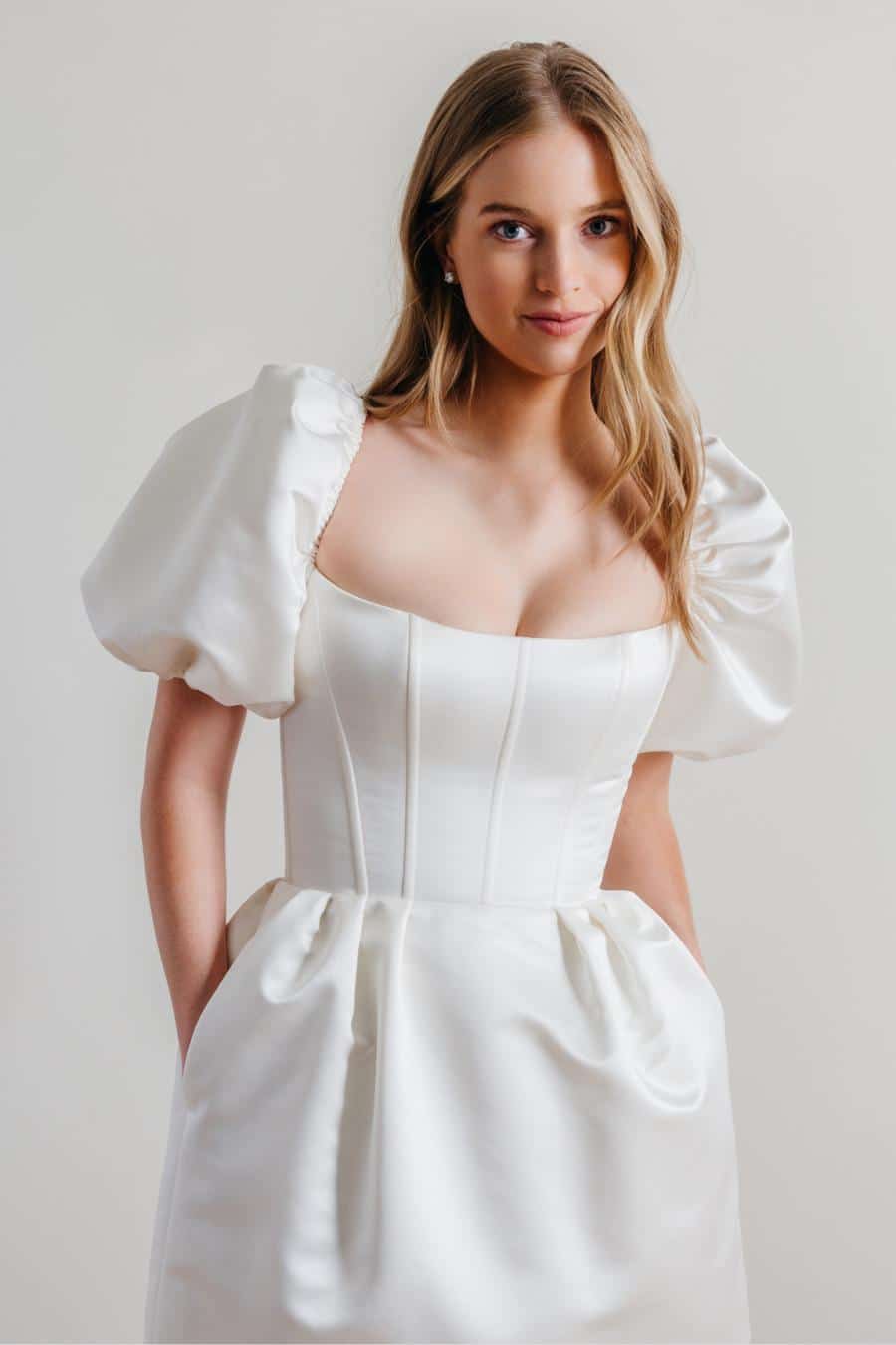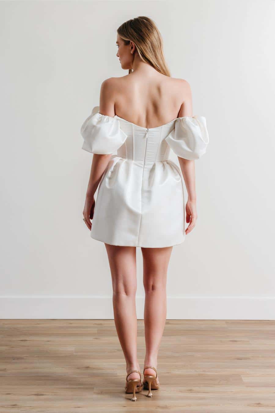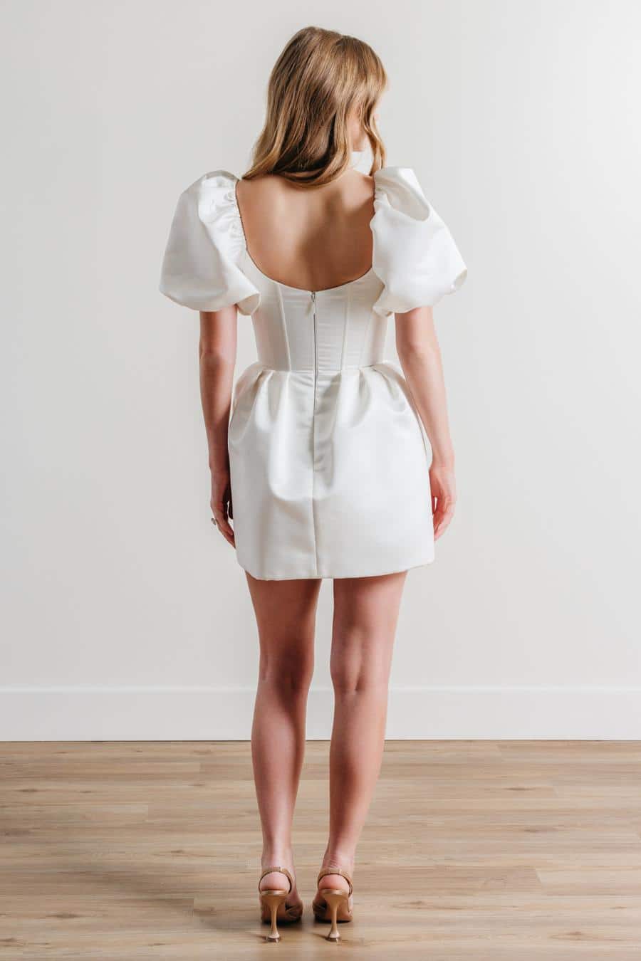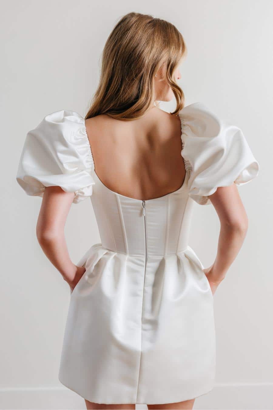 Verspieltheit trifft auf Glanz. Pierres strukturierte Baronette-Satin-Silhouette ist mit Puffärmeln und einem Korsett-Mieder für die perfekte Balance aus Süße und Frechheit ausgestattet. Ein Mini mit der Energie der Hauptfigur.