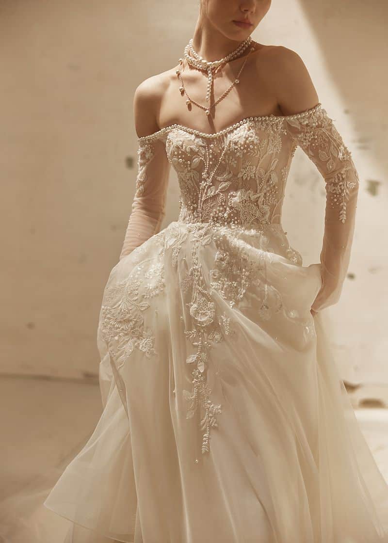Feine Details aus zarter Spitze und ein Hauch von schimmerndem Tüll verleihen dem Kleid eine märchenhafte Leichtigkeit, ohne dabei auf Eleganz zu verzichten. Ob für die große kirchliche Trauung oder eine romantische Gartenhochzeit – dieses Kleid ist der perfekte Begleiter für einen unvergesslichen Auftritt.