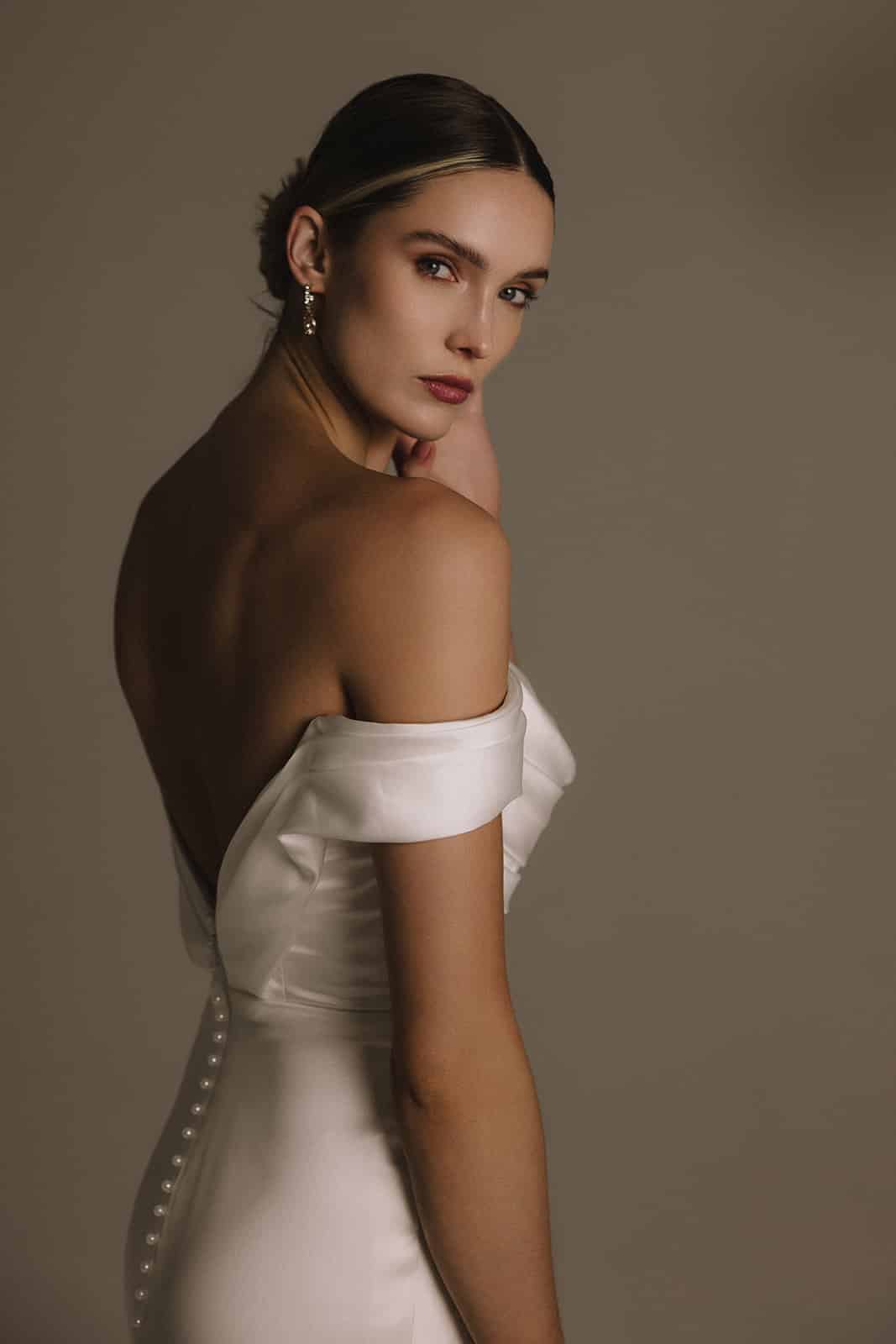 Die modellierte Schulterpartie von Allura legt sich über die Brust und verleiht dem herzförmigen Ausschnitt eine moderne Note. Die Ärmel wickeln sich zu einem atemberaubenden tiefen V-Rücken, wo eine Reihe von Kunstperlen zu einer kleinen, aber eleganten Schleppe fließt. Das Mieder sorgt für ein zeitgemäßes Styling, während die Falten von der Taille aus einen hohen Schlitz bilden, der einen Blick auf das Bein freigibt.