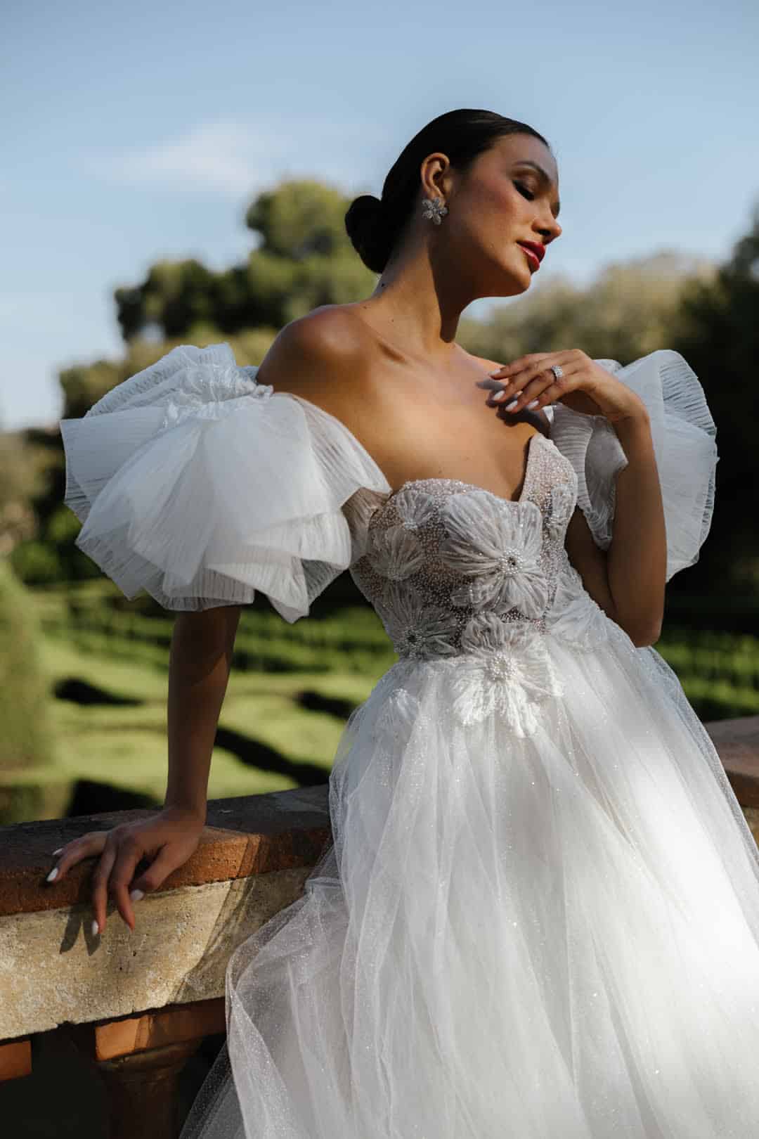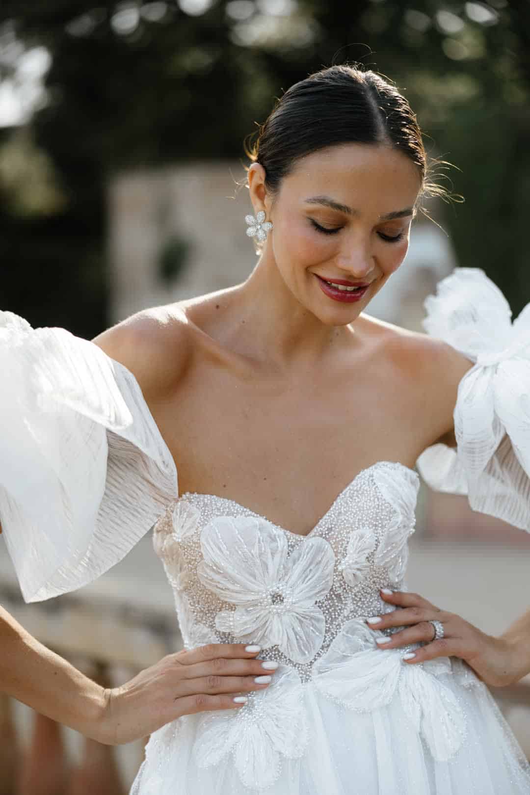 Dieses atemberaubende Brautkleid vereint Eleganz und Romantik auf perfekte Weise. Das Oberteil ist mit funkelnden Perlen und zarten Chiffon-Blumen verziert, die deinem Look eine besondere Note von Detailverliebtheit verleihen. Der fließende Chiffonrock umspielt sanft deine Silhouette und sorgt für einen leichten, mühelosen Auftritt.
