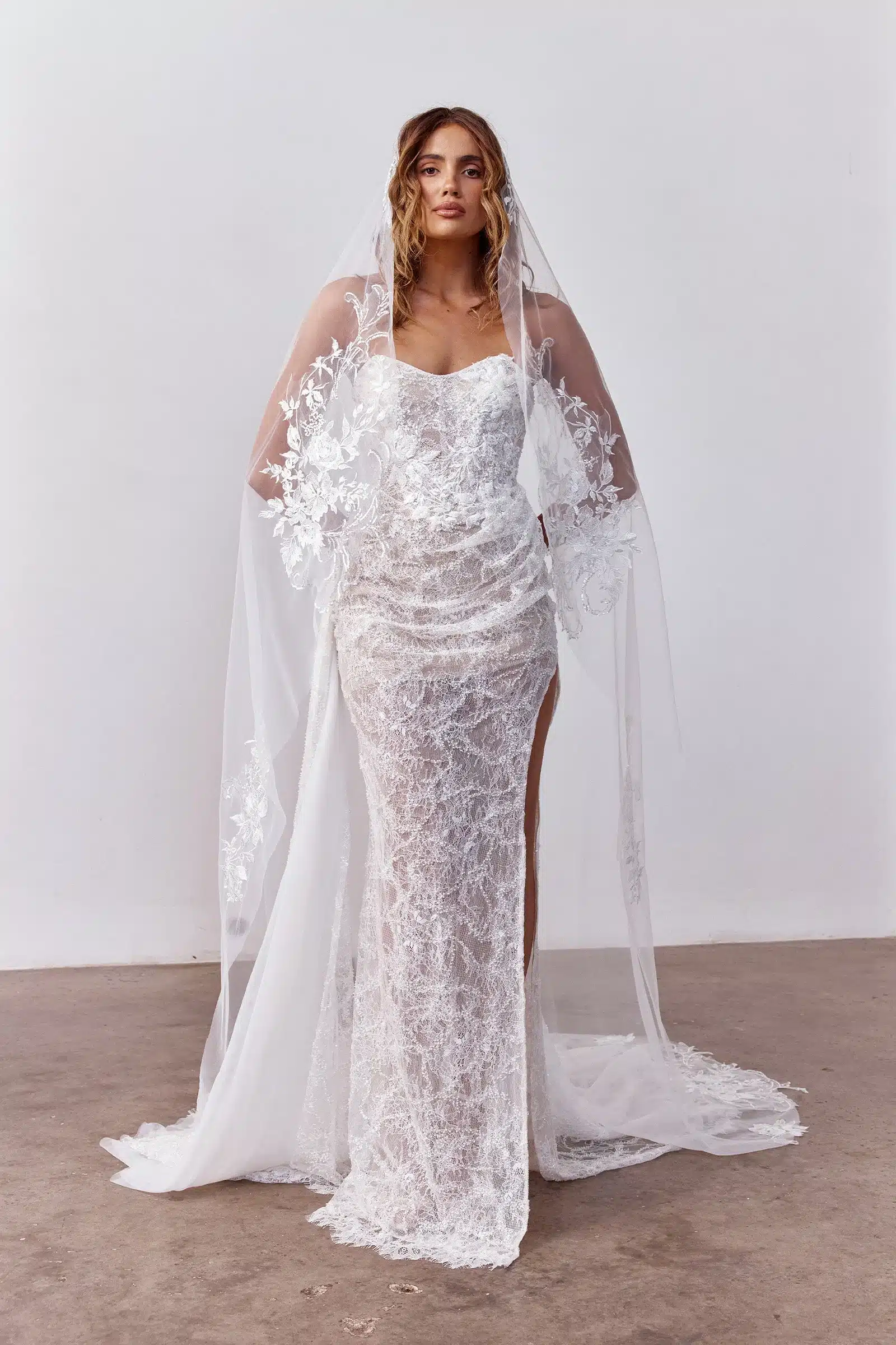 Eine sofortige Ikone, die jeden Moment unvergesslich macht. Cartier ist visuell reichhaltig, mit gestickten floralen Motiven und einzigartigen abstrakten Perlen, die im Licht glitzern. Dieses Partykleid passt sich den ganzen Tag über an und lässt sich mühelos von einem bodenlangen Kleid in ein asymmetrisches Midi- oder Minikleid verwandeln, während die elastische Wölbung den Körper umschmeichelt.