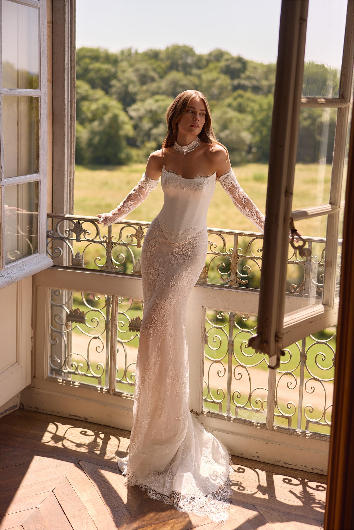 Dieses Kleid ist ein echter Hingucker mit verschiedenen Stylingmöglichkeiten. Das figurbetonte Brautkleid aus Spitze punktet mit seinem herzförmigen Ausschnitt und einem eleganten, trägerlosen Design. Abnehmbare Ärmel ergänzen das Kleid. Für noch mehr Individualität lässt sich das Kleid mit einem zusätzlichen Top aus Satin kombinieren. Dieses hat einen U-Ausschnitt und fällt sanft abgerundet über das Spitzenkleid. Ein Überrock kann zu dem Look ebenso kombiniert werden, was im Handumdrehen für einen spektakulären Auftritt sorgt.