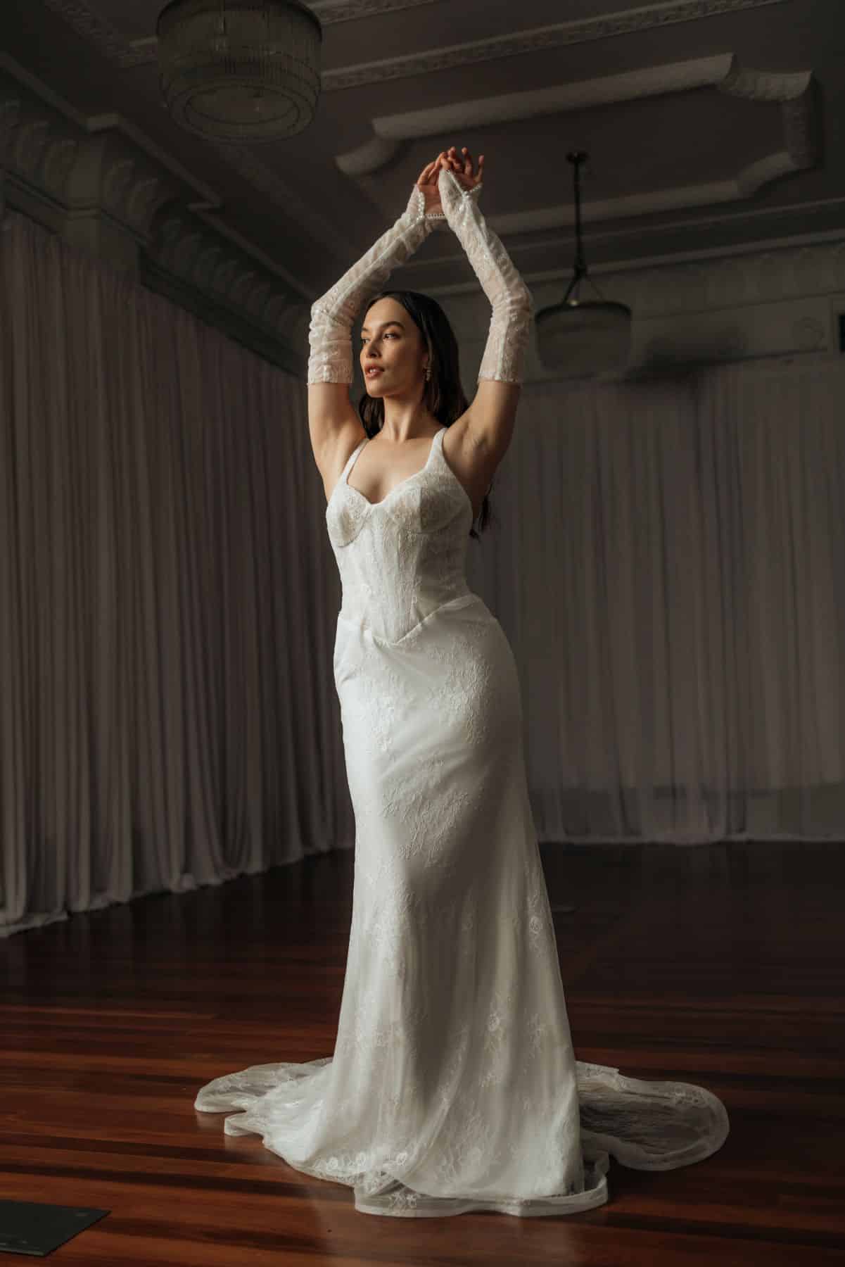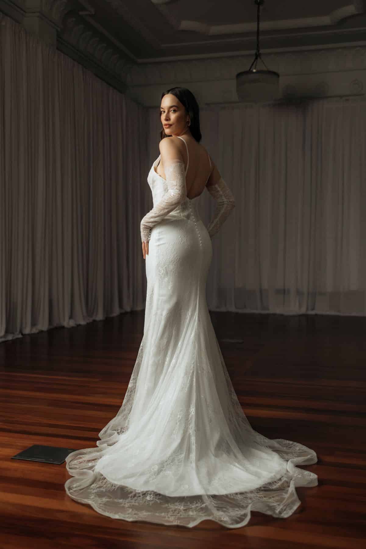 Cavalli aus französischer Chantilly-Spitze ist wie eine frische Sommerbrise. Der zarte Stoff ist über freiliegenden Stäbchen halbtransparent, während dünne Träger für Halt und ein klassisches Dekolleté sorgen. Eine Baskettentaille verleiht einen Hauch von Märchen, bevor der leichte Rock in eine hübsche Schleppe fällt.