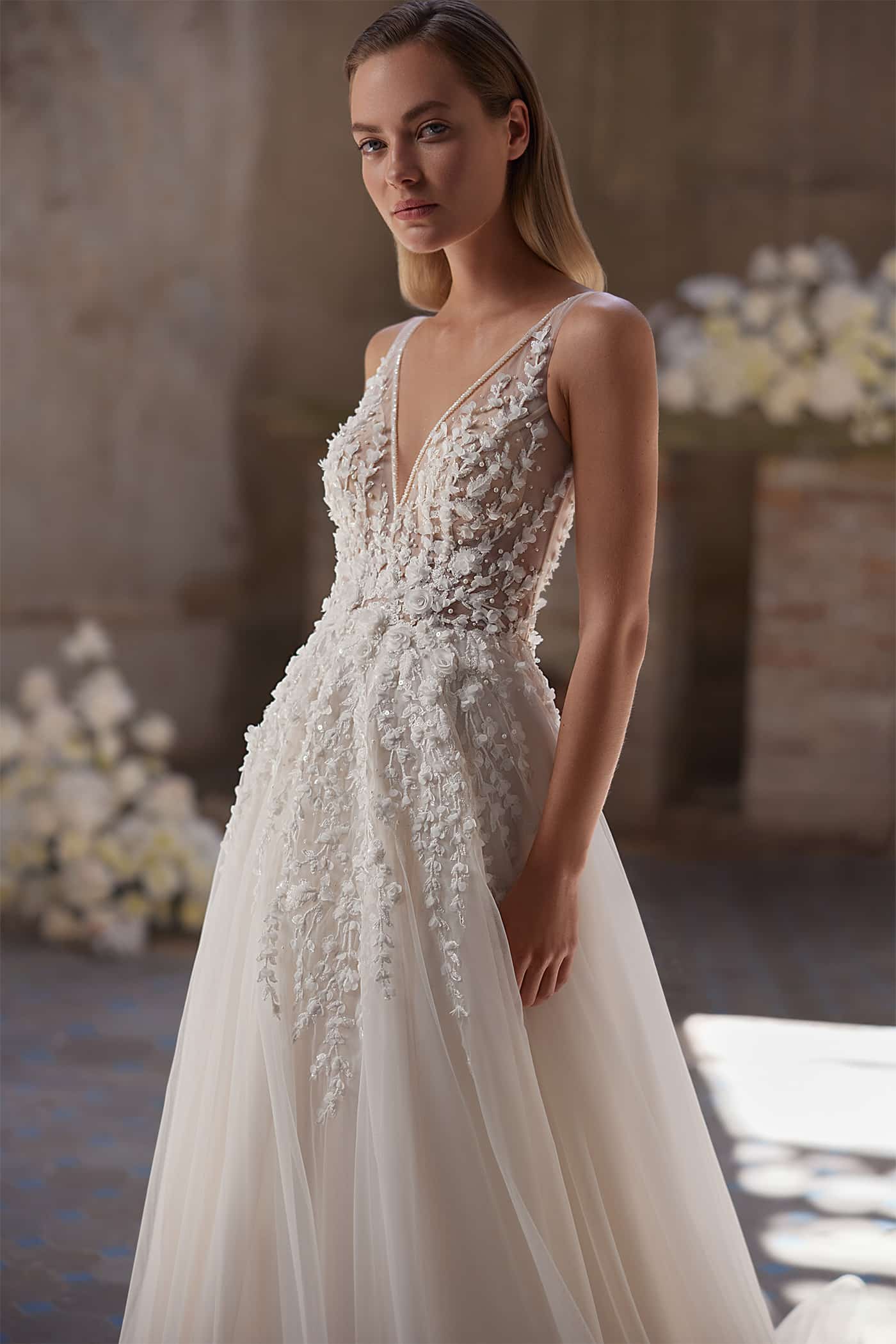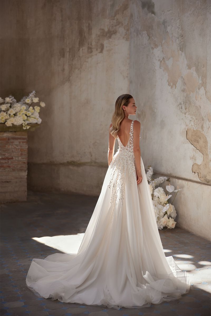 Der tiefe V-Ausschnitt vorne betont das Dekolleté, während zarte, florale Spitze harmonisch in den fließenden Tüllrock übergeht. Die kunstvolle 3D-Spitze verleiht dem Kleid eine lebendige, moderne Note und lässt jede Bewegung magisch wirken. Ein Design, das Leichtigkeit und Glamour verbindet – perfekt für deinen großen Auftritt!