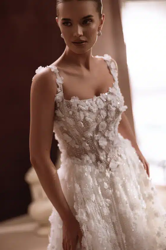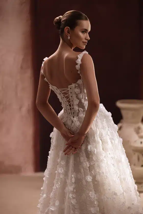 Cintra verkörpert Eleganz in einer modernen Interpretation. Das strukturierte Oberteil formt eine harmonische Silhouette, während der Sweetheart-Ausschnitt eine romantische Note setzt. Der glatte Rock geht fließend in eine elegante Schleppe über und vereint Komfort mit Raffinesse. Ein Kleid für Bräute, die einen modernen Klassiker suchen, der zeitlos bleibt.