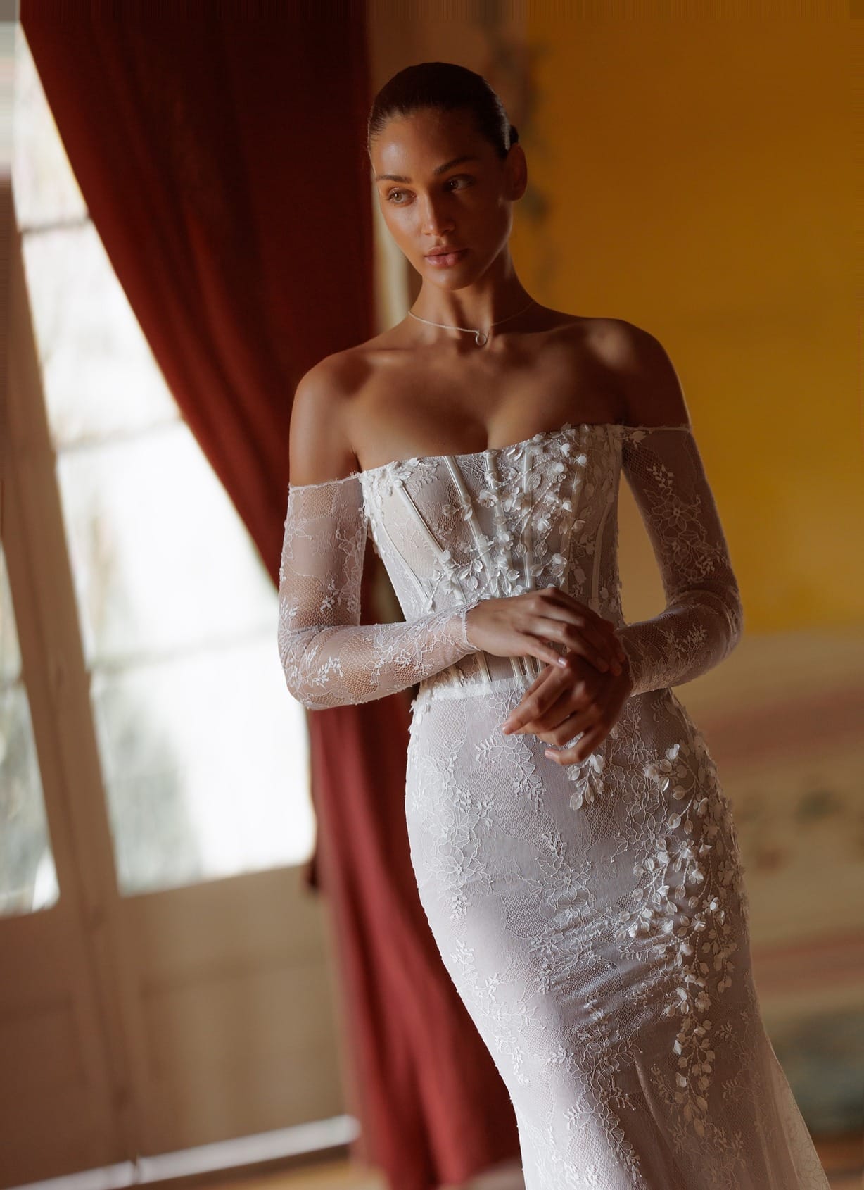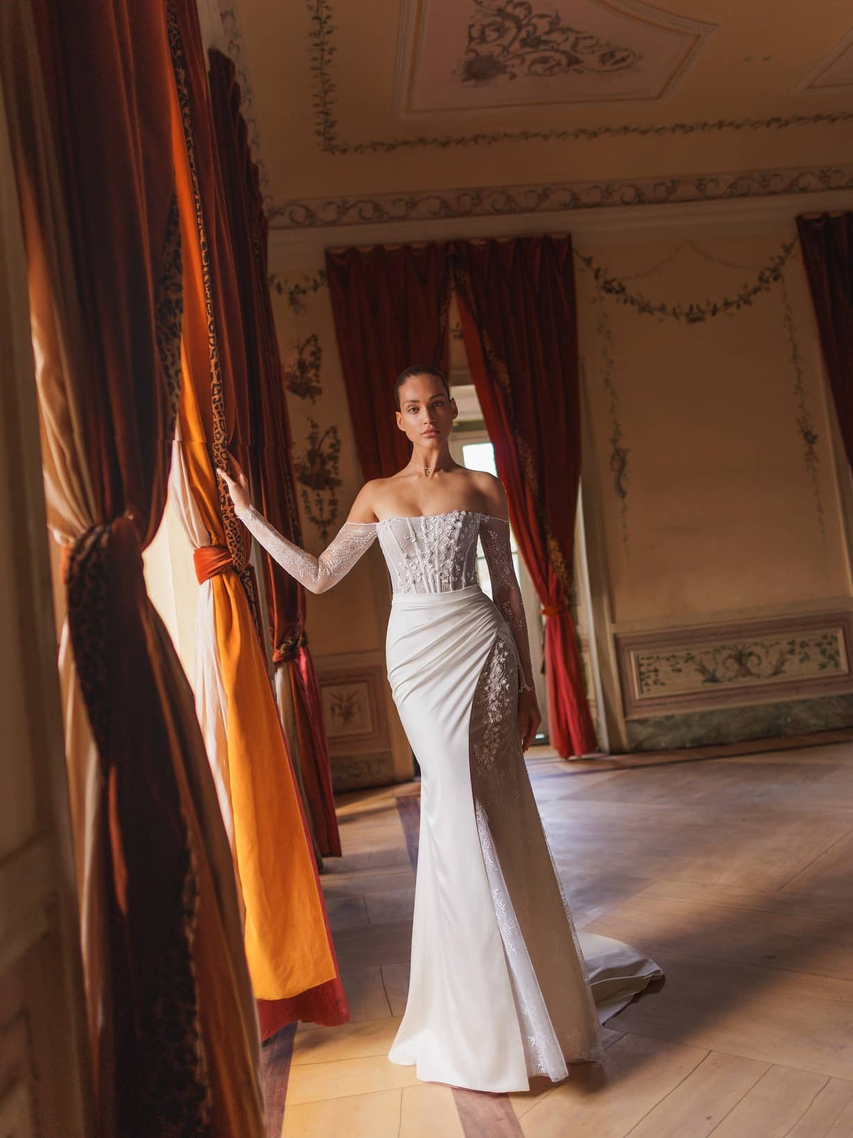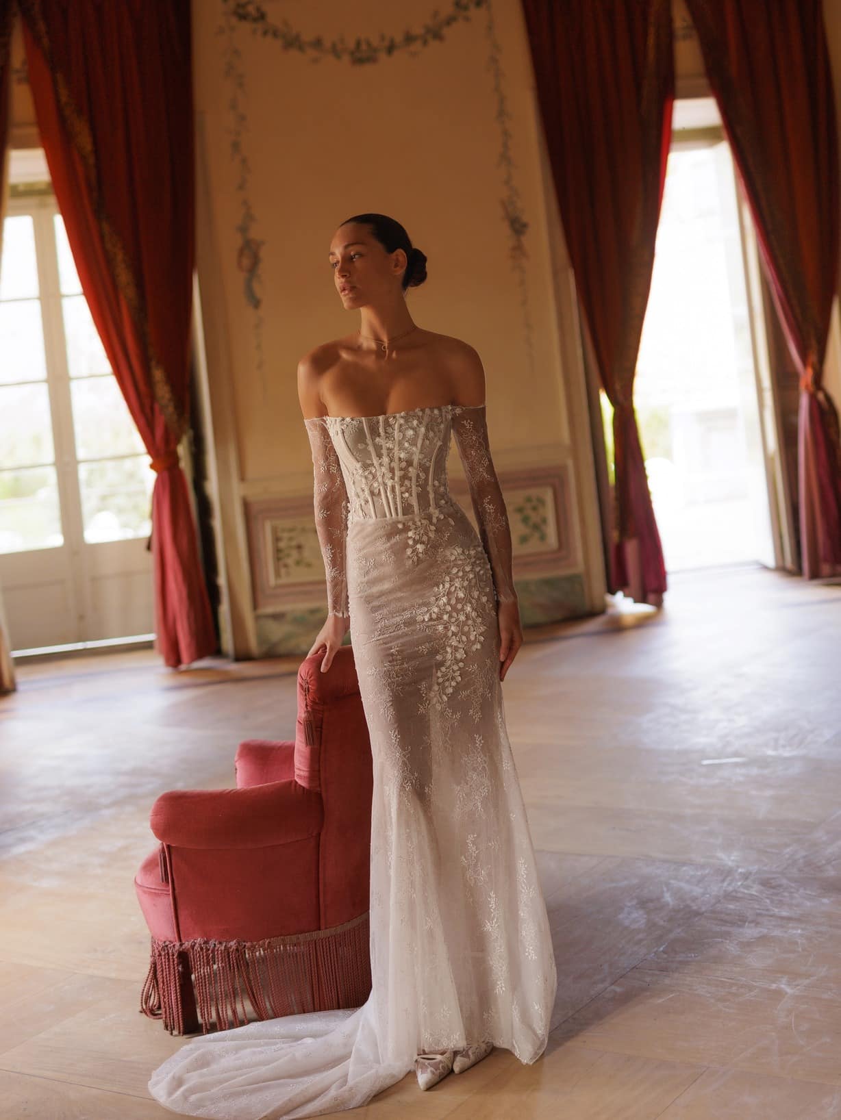 Anmutiges Off-Shoulder-Kleid mit tailliertem Korsettoberteil und leicht bestickten langen Ärmeln. Feine florale Applikationen, asymmetrisch über Hüfte, Taille und Ausschnitt platziert, verleihen dem Design Leichtigkeit, während der abnehmbare, elegante Überrock mit einem langen Schlitz auf der linken Seite einen Hauch zeitloser Eleganz hinzufügt.