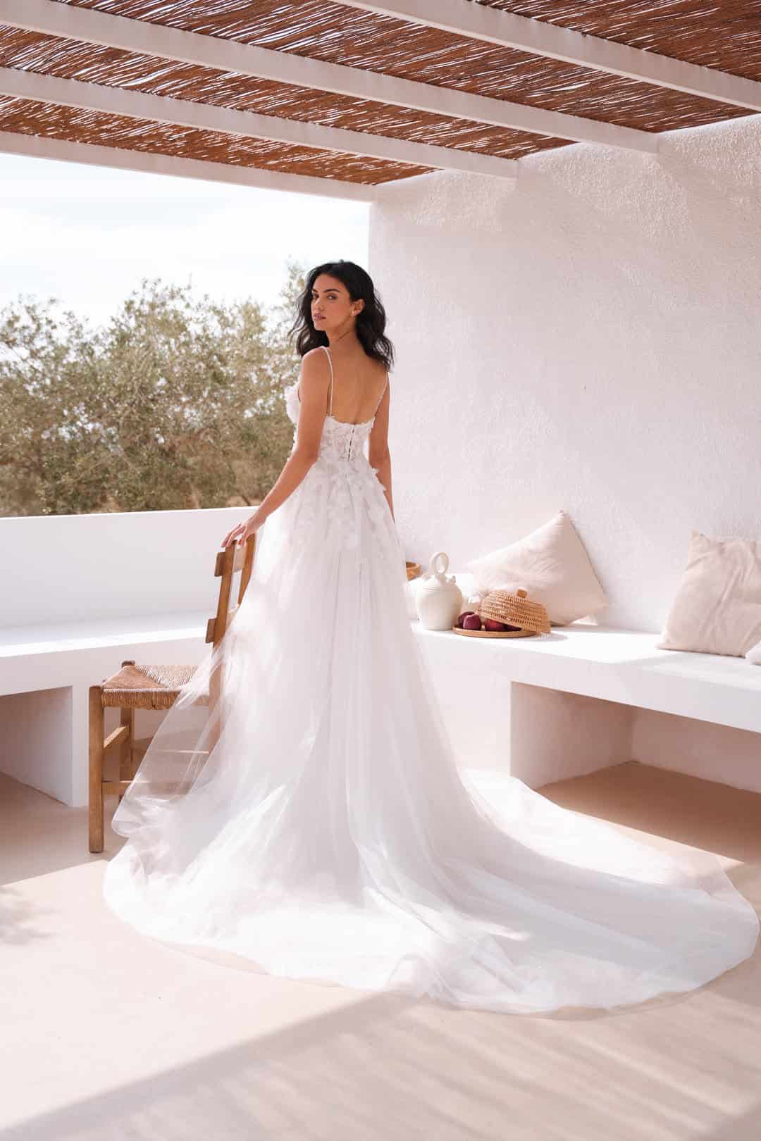 Zarter Tüll trifft auf feine Spitze, während 3D-Blumen vom kunstvoll verzierten Oberteil fließend in den Rock übergehen. Der feminine V-Ausschnitt mit schmalen Trägern sorgt für eine elegante Silhouette, während der tiefe Schlitz und der transparente Rock mit darunterliegendem Minikleid moderne Sinnlichkeit ausstrahlen. Ein Kleid, das Romantik und Coolness perfekt vereint.