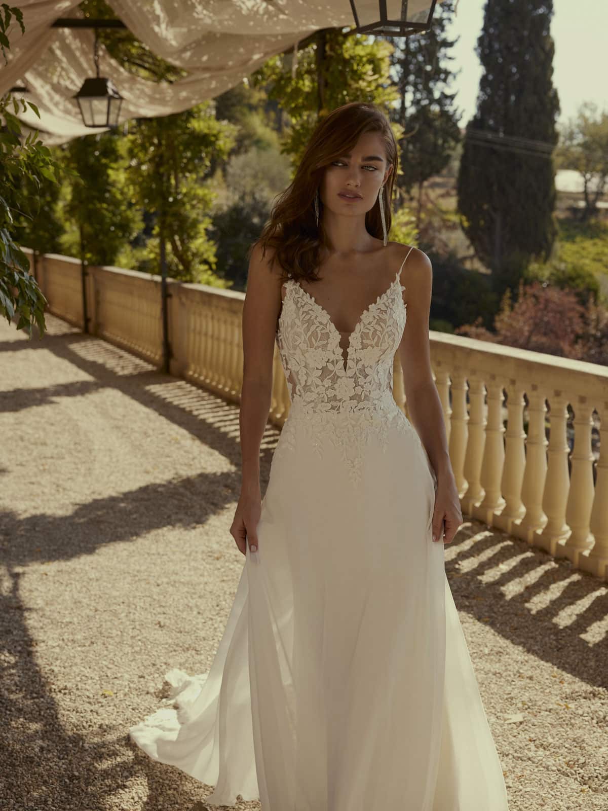Das bezaubernde Illusionsmieder, das mit aufwendiger Spitze und schimmernden Pailletten verziert ist, setzt einen hypnotisierenden Akzent für Ihren besonderen Tag. Mit seiner schmeichelhaften A-Linien-Silhouette und dem anmutigen Chiffon-Rock strahlt dieses Kleid zeitlosen Charme aus. Mit der kapellenlangen Schleppe, die zart mit Spitze besetzt ist, wird das Debra-Kleid die Herzen erobern und einen bleibenden Eindruck hinterlassen. Dieses Kleid ist auch ohne Spitze an der Schleppe erhältlich – Debra-B.