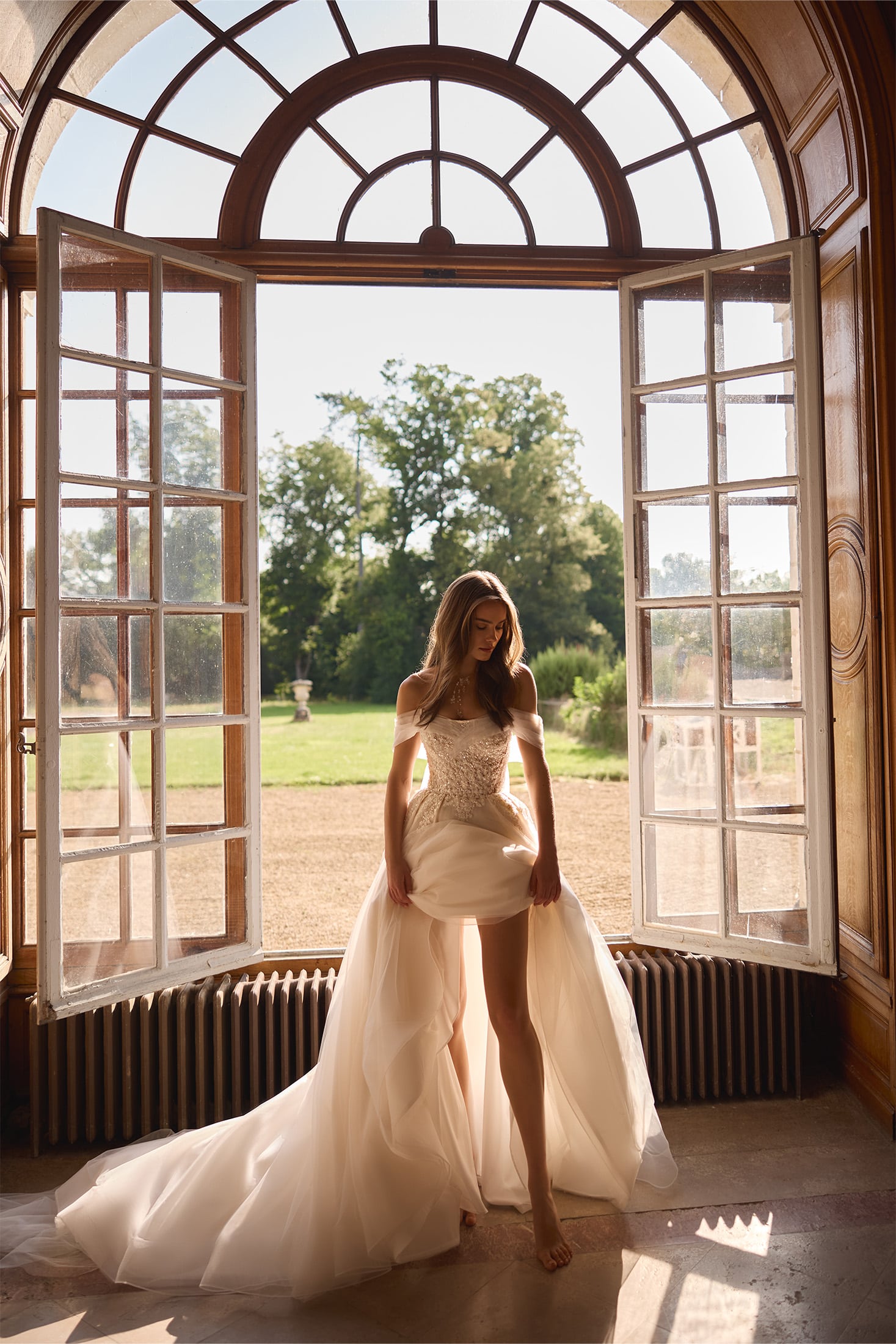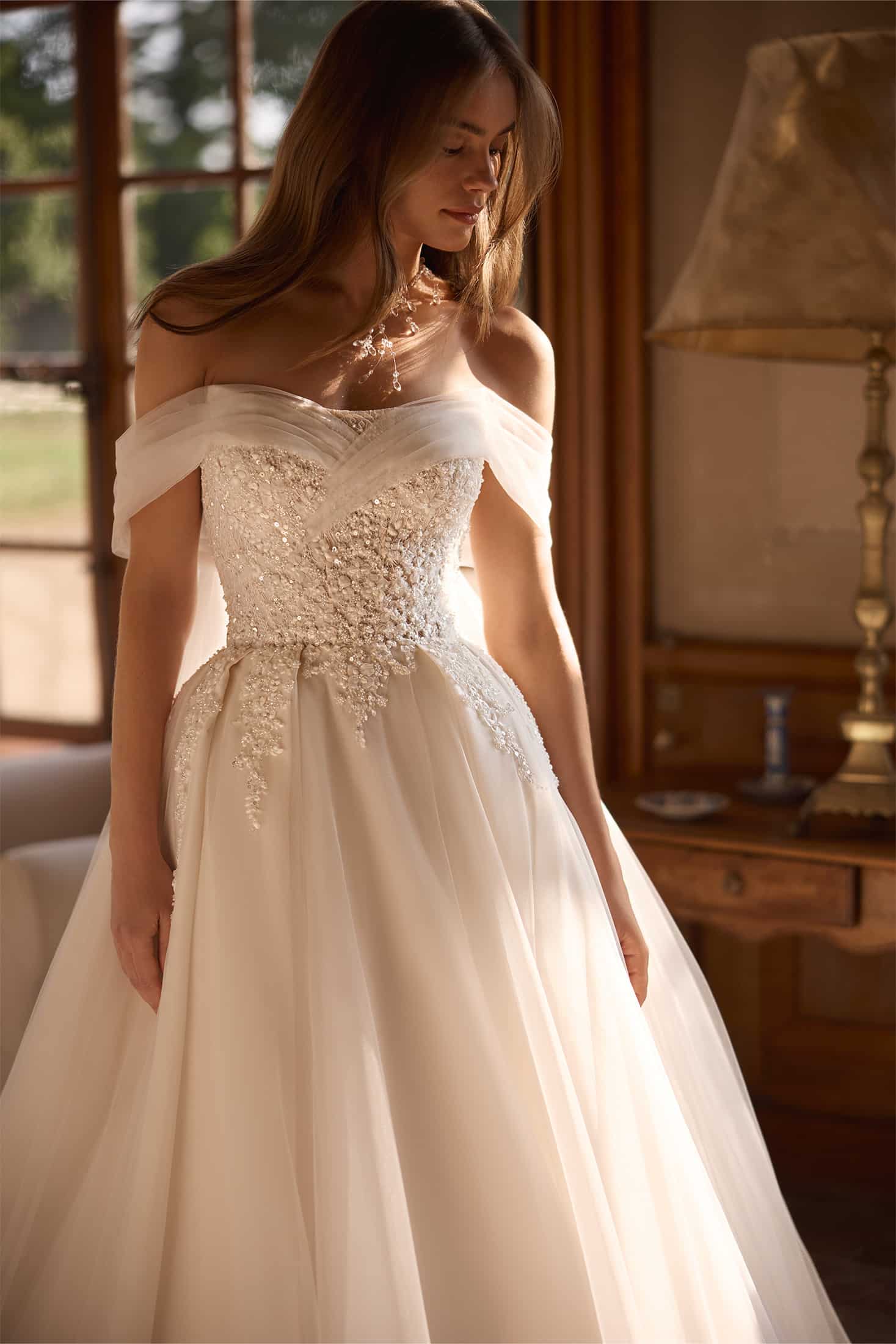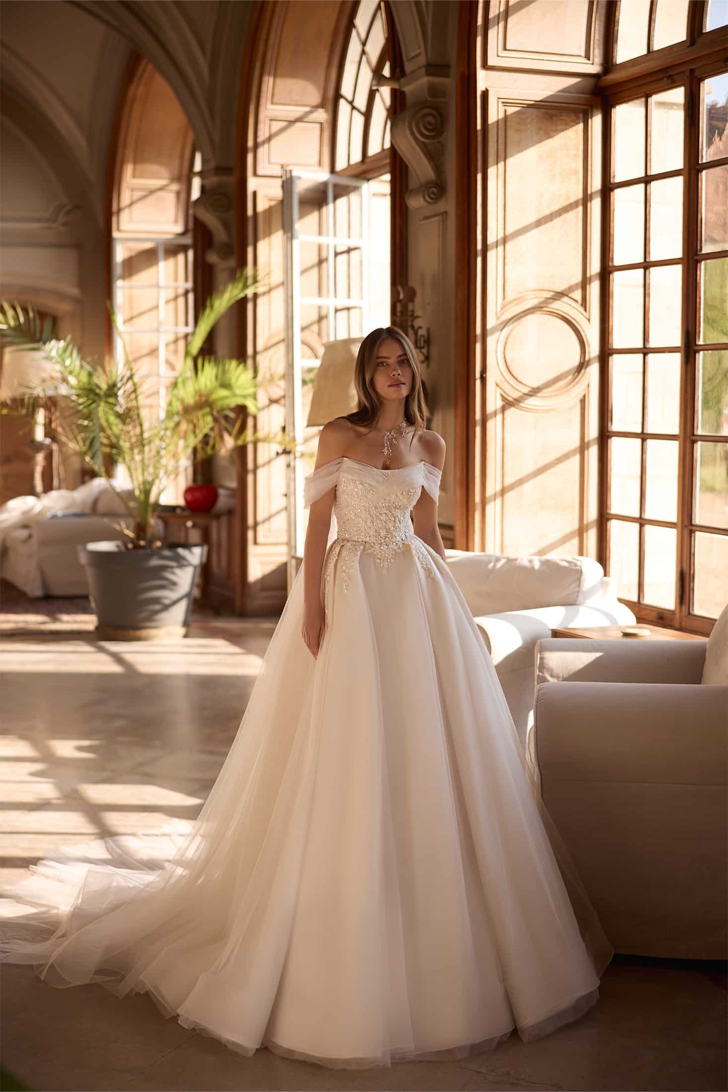 Dieses Brautkleid in ausgestellter A-Linie vereint Moderne und Eleganz. Zarte Spitze im Oberteil fließt sanft in den Tüllrock und schafft einen harmonischen Look. Der leicht gewellte Ausschnitt in Kombination mit den Off-Shoulder-Ärmeln verleiht einen sinnlichen Akzent.