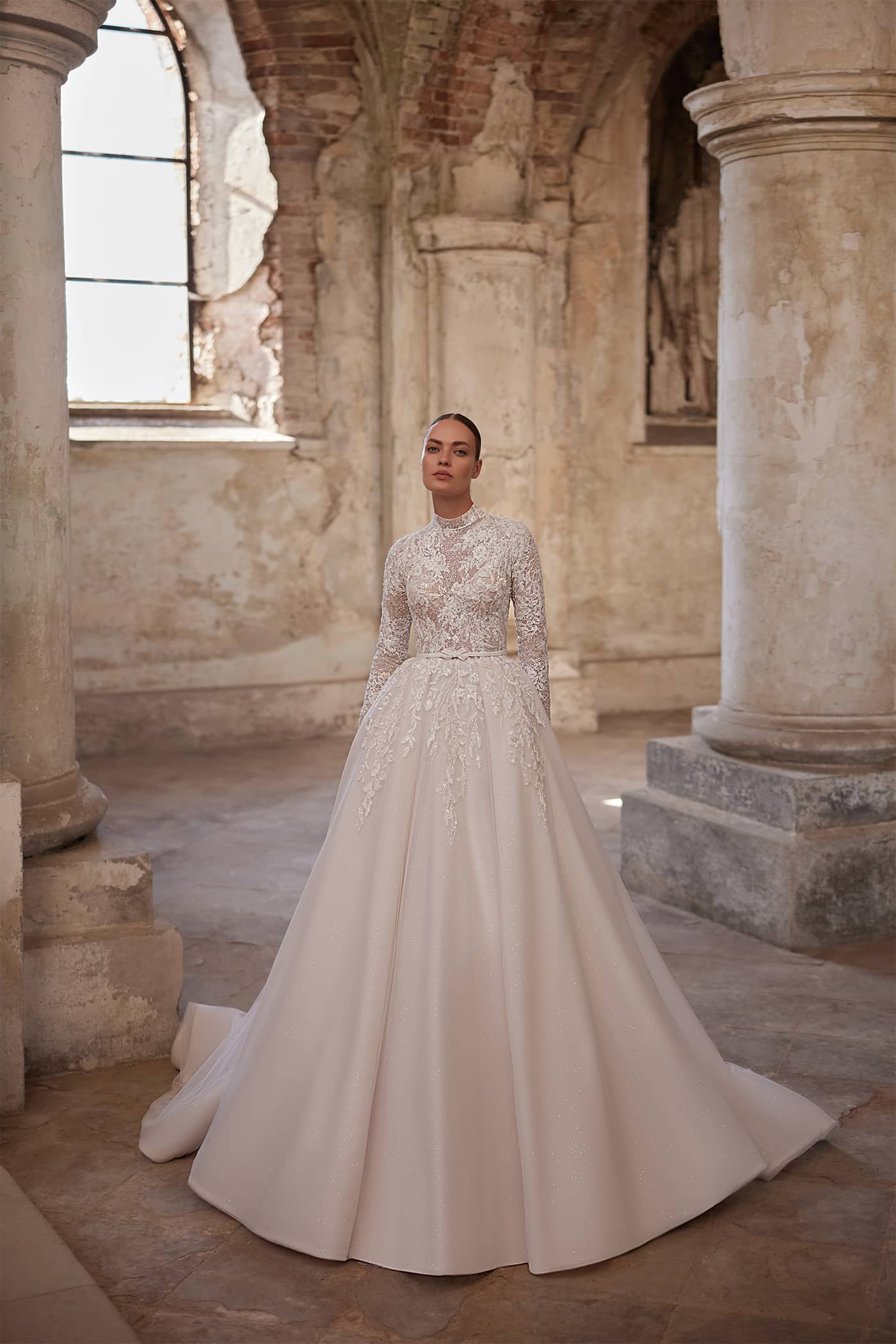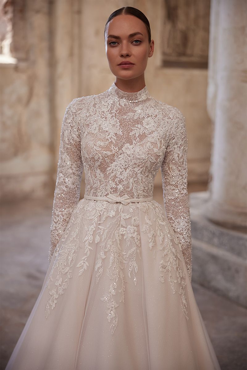 Eleganz, Anmut und moderne Romantik – das Brautkleid Evangeline ist die perfekt Wahl für Bräute, die zeitlose Schönheit mit einem hauch von Extravaganz verbinden möchten. Das Oberteil aus feinster Spitze mit hochgeschlossenem Kragen und langen, transparenten Ärmeln besticht durch filigrane Stickereien, die subtil schimmern und für einen luxuriösen Look sorgen. Die figurbetonte Taille geht fließend in einen weiten A – Linien Rock aus sanftem Tüll über, der für ein traumhaftes Volumen sorgt und zugleich eine märchenhafte Silhouette kreiert.
