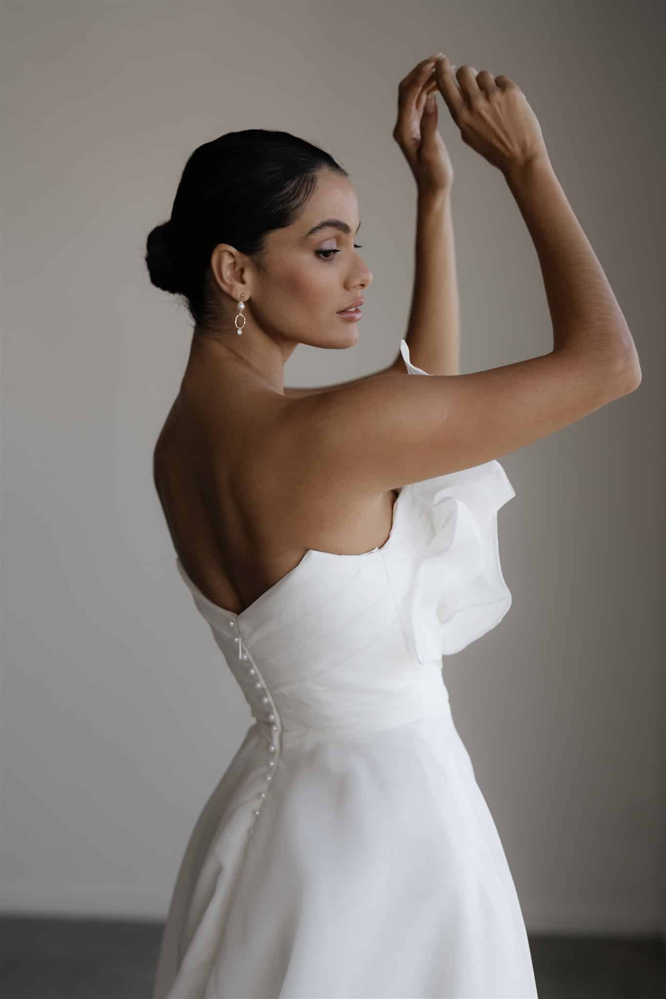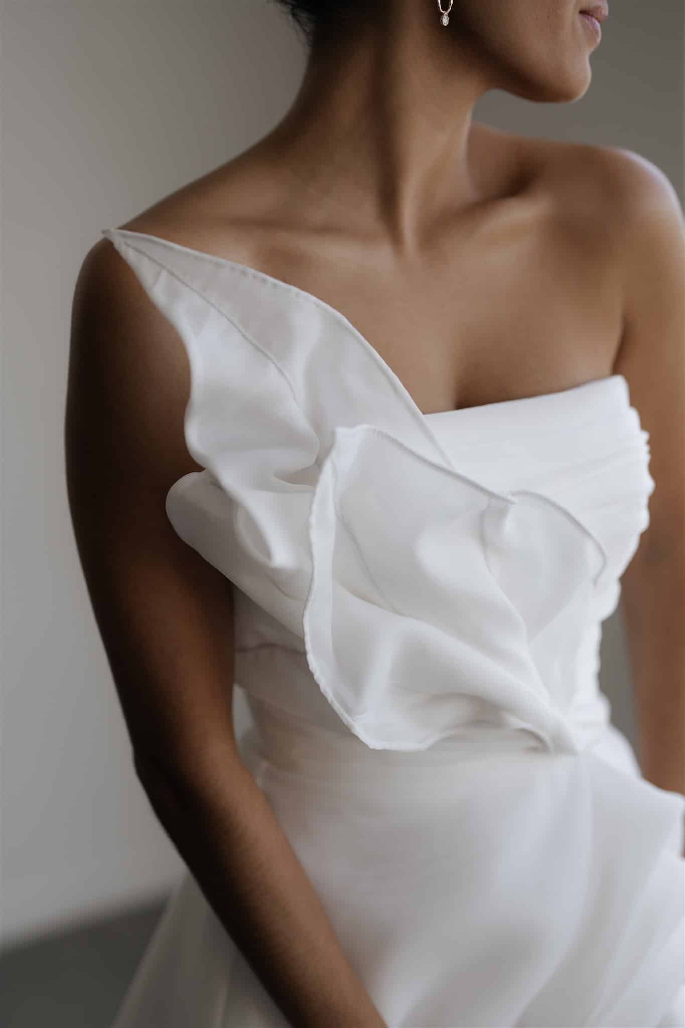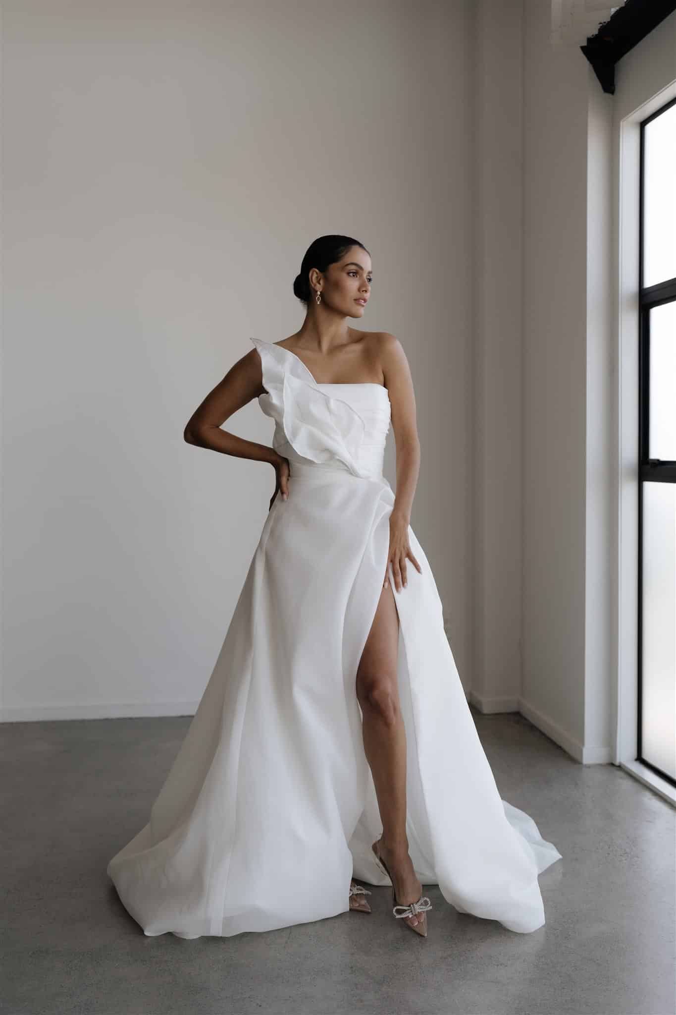 Für einen Auftritt, der den Oscars würdig ist, ist Gelsomina genau das Richtige. Dieses atemberaubende Kleid, italienisch für Jasmin, zeigt handgefertigte Blumenblätter, die in biegsamer Bindung über ein wunderschönes plissiertes Mieder gelegt wurden. Dieses von Künstlern inspirierte Kleid ist wirklich einzigartig, mit seinem hoch gerafften Schlitz für zusätzliches Volumen und Sex-Appeal und einem mit Perlen besetzten Rücken, der dieses Kleid auf die nächste Stufe hebt. Gelsomina ist glamourös und auffallend und wird dir an deinem großen Tag mit seiner aufsehenerregenden Schönheit die Sprache verschlagen.