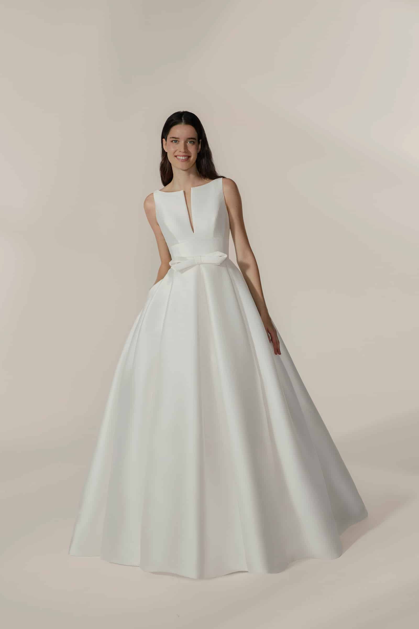 Ein Brautkleid, das Eleganz neu definiert: Mit klaren, minimalistischen Linien und einer schlanken Silhouette setzt es auf pure Modernität. Der auffällige V-Ausschnitt zieht alle Blicke auf sich, während die ikonische Taillenschleife einen femininen Akzent setzt. Das skulpturale Volumen verleiht der reduzierten Form eine besondere Spannung – für einen Look, der zeitlos, selbstbewusst und unvergesslich ist.