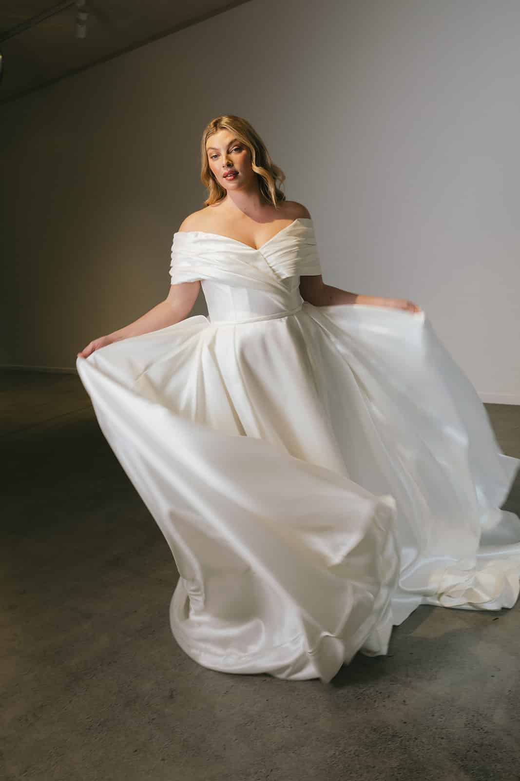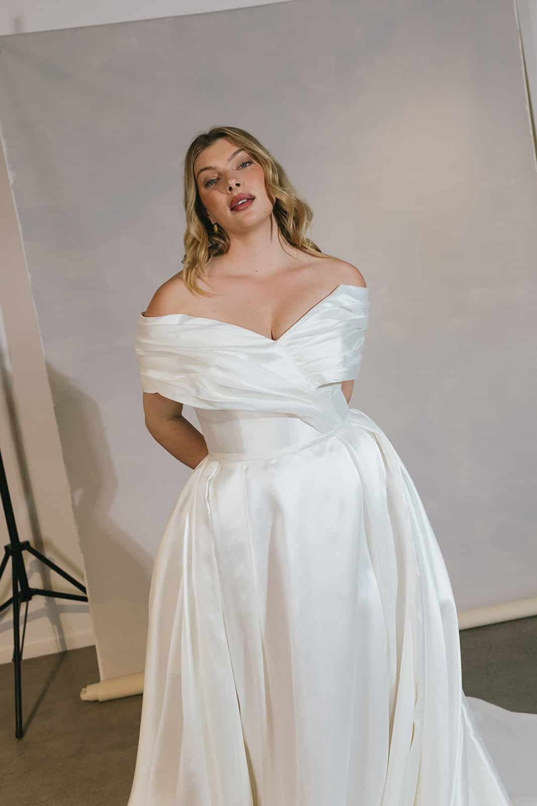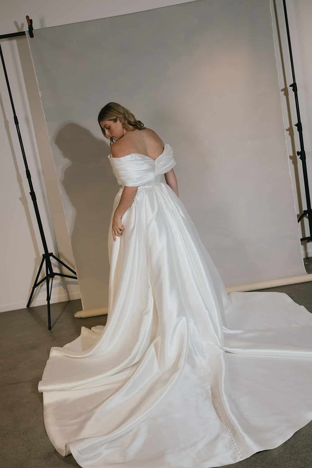 Isabella strahlt die Essenz einer Prinzessin aus. Das aus luxuriösem Mikado-Satin gefertigte Mieder sorgt für eine definierte und schmeichelhafte Figur, während die plissierten Off-the-Shoulder-Ärmel für königliche Raffinesse sorgen. Der in Falten gelegte Rock sorgt für eine romantische Silhouette, ohne zu überladen, und schafft die perfekte Balance zwischen Anmut und Opulenz. Zum Abschluss fließt eine Reihe von Kunstperlen über die atemberaubende Schleppe und sorgt für einen bleibenden Eindruck. Isabella verfügt außerdem über Taschen, die für einen Hauch von modernem Flair sorgen.