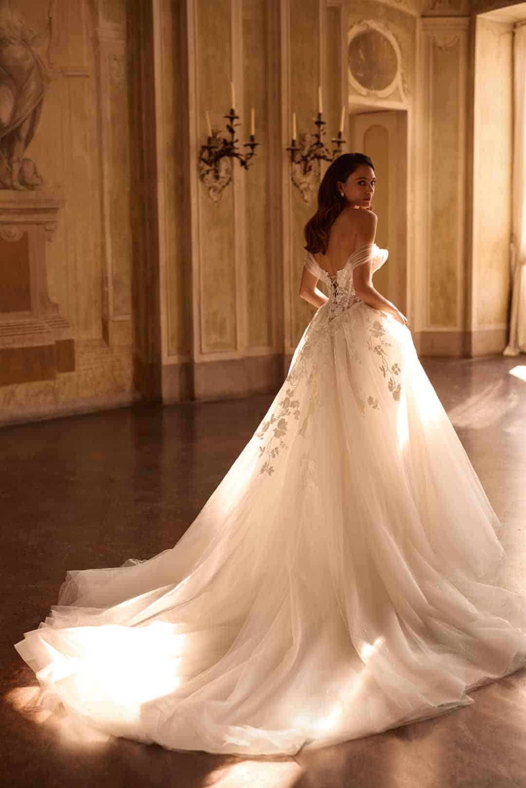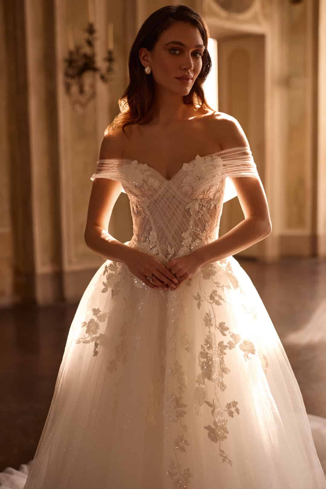 Zarter Tüll trifft auf feine Spitze, die sich kunstvoll vom bestickten Oberteil in den fließenden Rock fortsetzt. Der Carmen-Ausschnitt mit Off-Shoulder-Trägern setzt die Schultern feminin in Szene, während die Baskentaille vorn und hinten eine schmeichelhafte Silhouette formt. Raffiniert übereinandergelegter Tüll verleiht dem Oberteil eine moderne Note, die in perfekter Harmonie mit den romantischen Spitzendetails verschmilzt – ein Kleid für Bräute, die klassische Romantik mit zeitgemäßem Stil verbinden möchten.