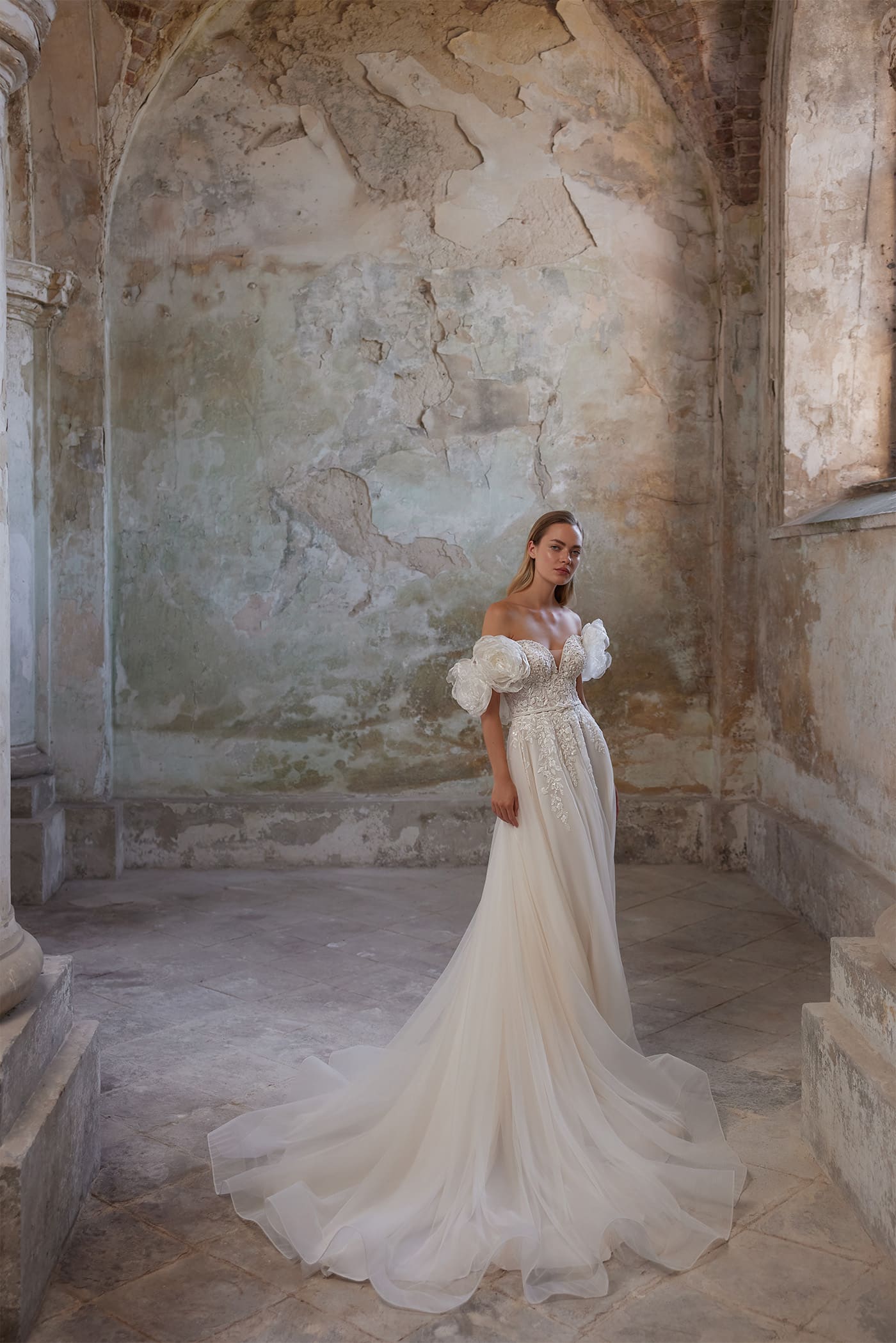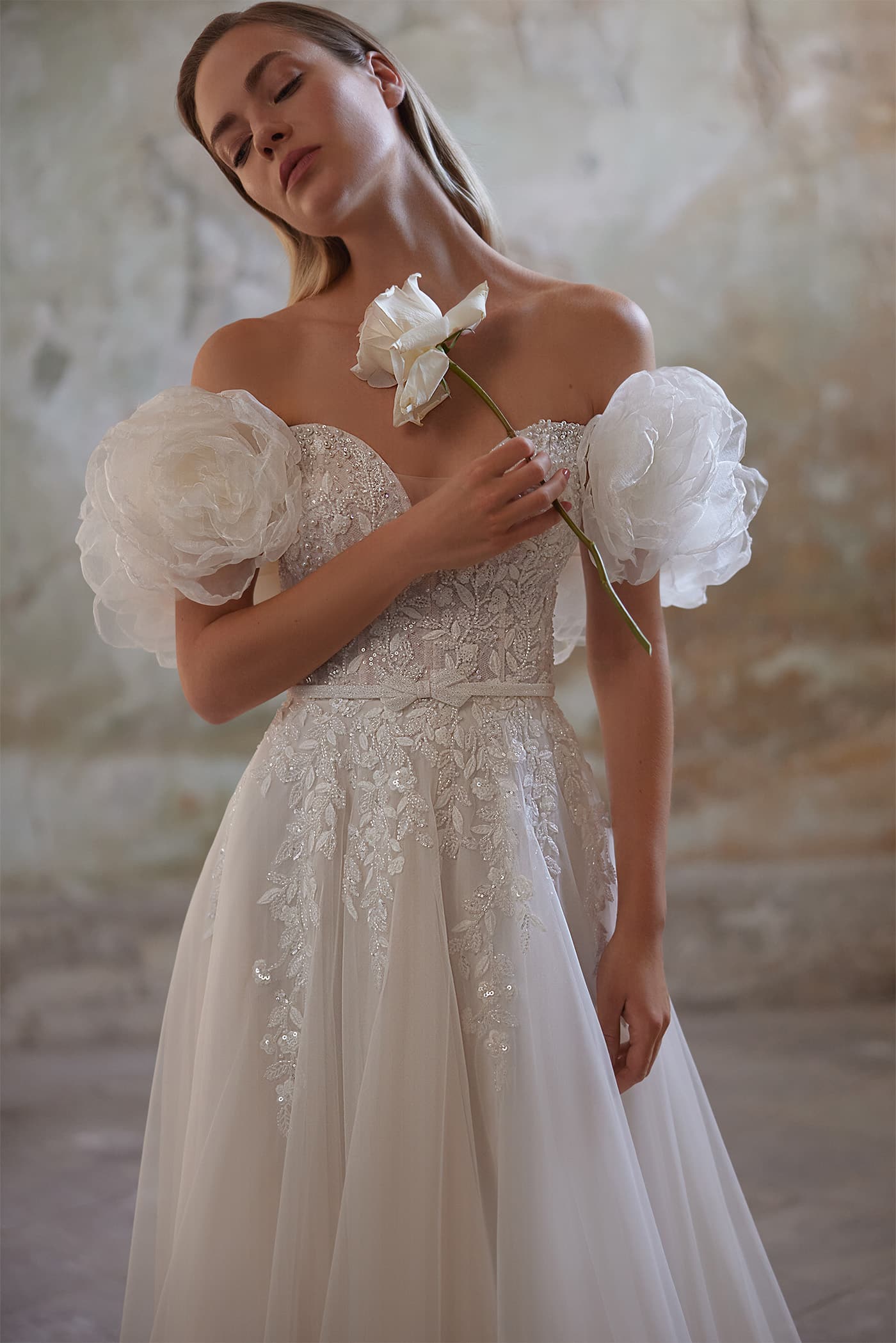 Dieses zauberhafte, trägerlose Brautkleid vereint Romantik und Moderne. Das Oberteil begeistert mit zarter Spitze und funkelnden Pailletten, die ein edles Highlight setzen. Der fließende Tüllrock sorgt für Leichtigkeit und verleiht dir einen traumhaften, luftigen Look. Ein romantisches und raffiniertes Design – perfekt für die Braut, die strahlen möchte.