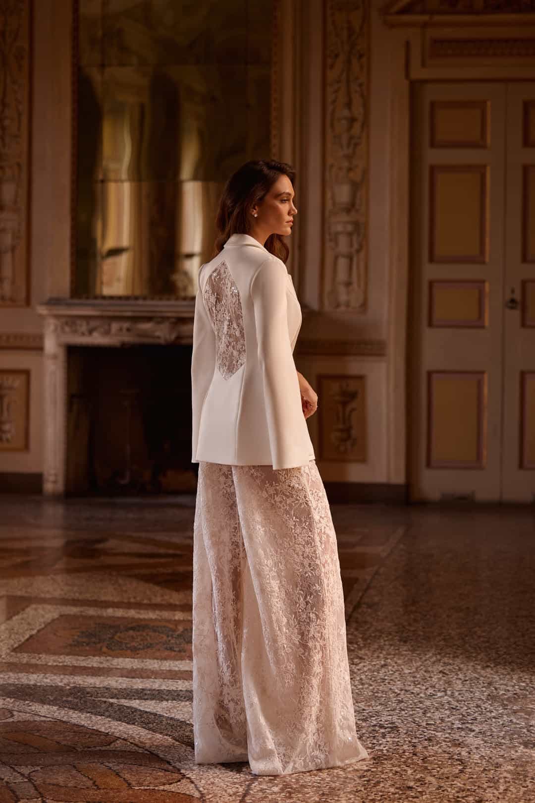 Die weit ausgestellte Hose in Spitze ist ein echter Hingucker – leicht transparent und in jedem Fall stillvoll.