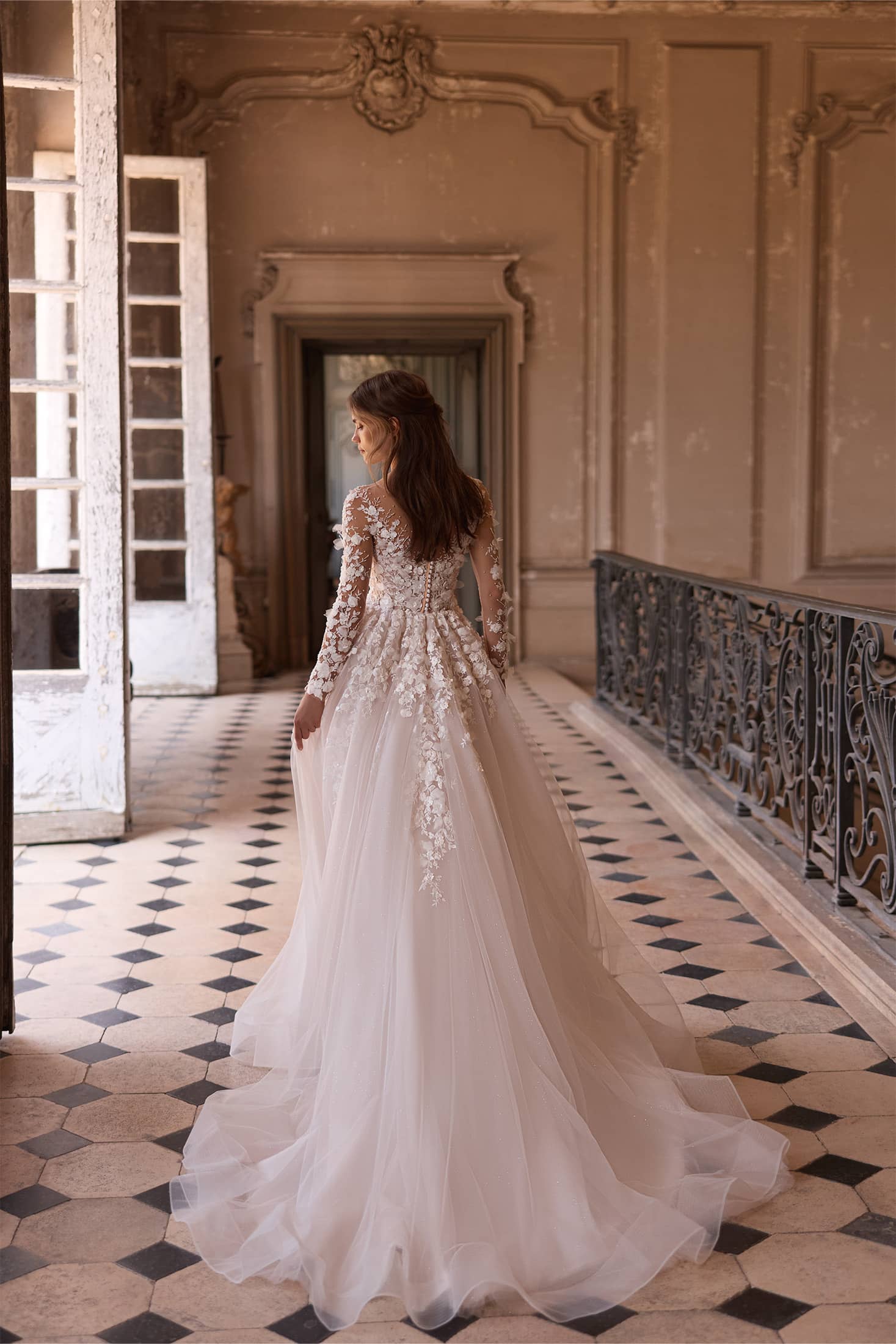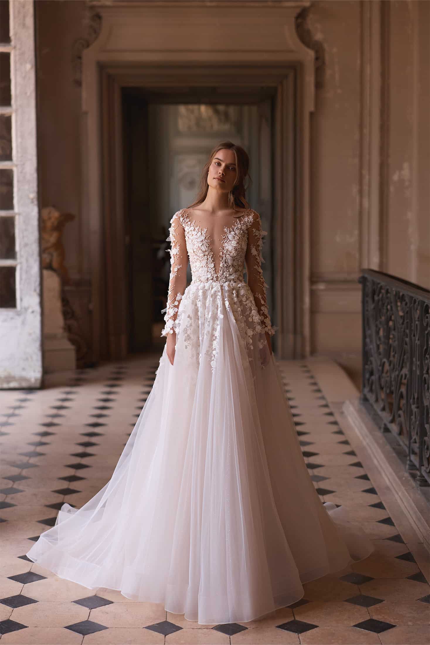 Modern und Romantik vereint dieses ausgestellte A-Linien-Kleid. Zarte Spitze im Oberteil fließt sanft in den Tüllrock und schafft einen harmonischen Look. Der hautfarbene Tüll verleiht die Illusion eines tiefen V-Ausschnitts vorne und eines runden Ausschnitts im Rücken. Die langen Spitzenärmeln sorgen für zusätzliche Eleganz.