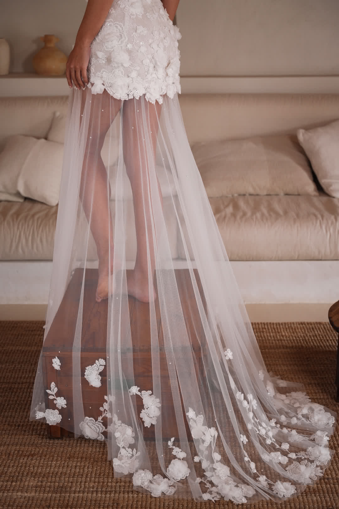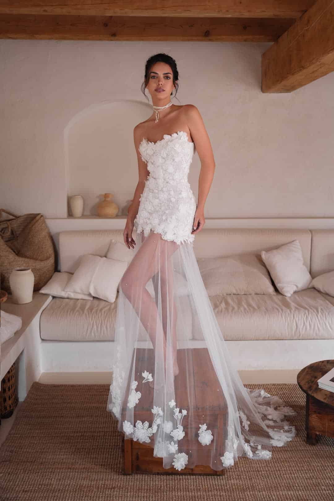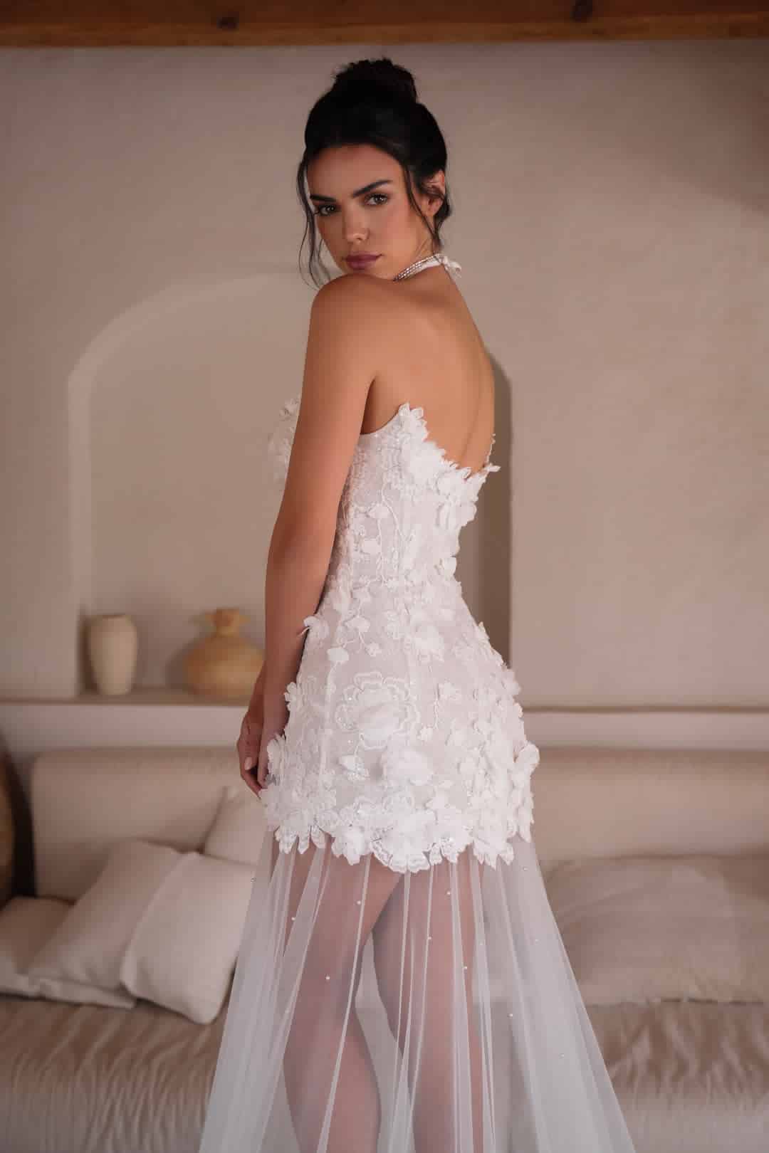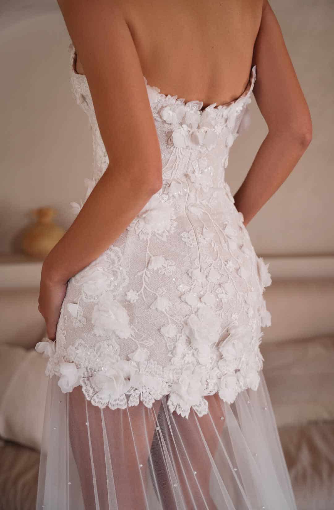 Verwandle deinen großen Tag in einen glamourösen Auftritt mit diesem außergewöhnlichen Brautkleid! Die kurze-lang Optik kombiniert das Beste aus beiden Welten: Ein elegantes, kurzes Kleid mit detailverliebter 3D-Spitze, das sanft in einen transparenten Tüllrock übergeht. Der Rock ist dezent mit wenigen Perlen besetzt, was deinem Look eine zarte und edle Note verleiht. Als besonderes Highlight findet sich die filigrane Spitze an der Schleppe wieder, die deinen Auftritt atemberaubend abrundet. Dieses Brautkleid sorgt dafür, dass du dich wie eine echte Königin fühlst – extravagant, einzigartig und absolut bezaubernd!