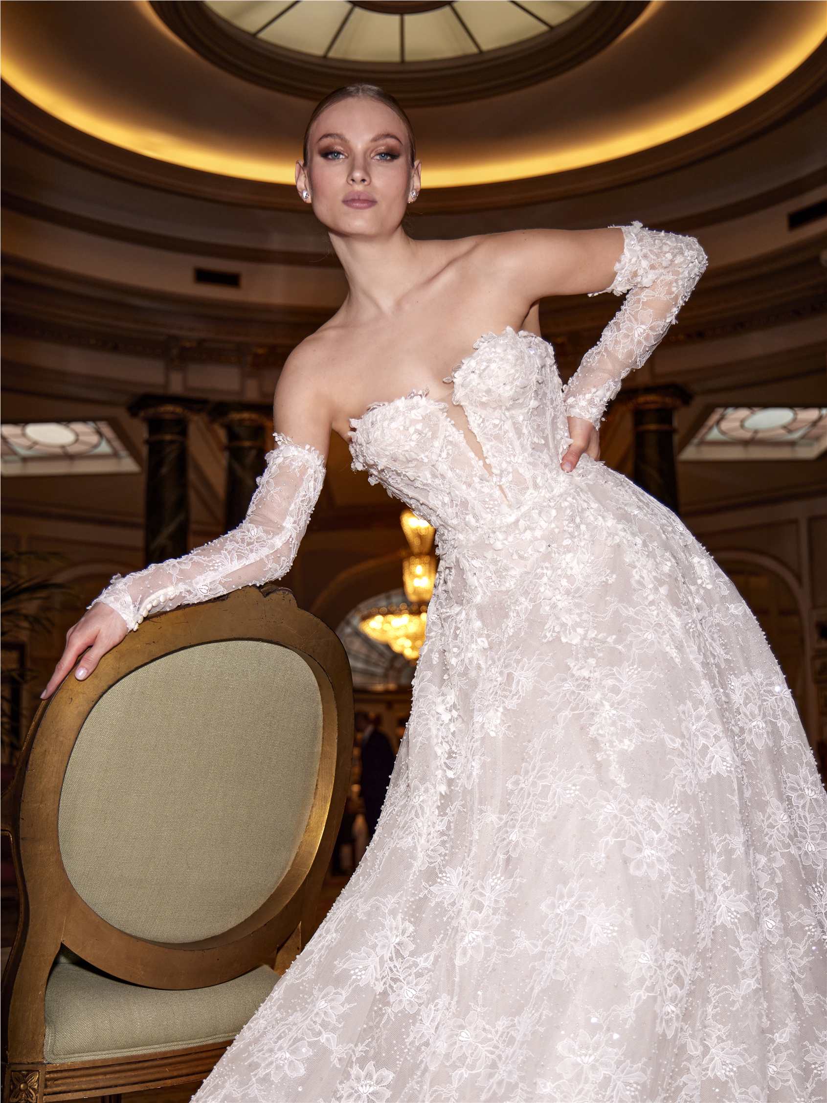 Dieses A-Linien-Brautkleid vereint klassische Sinnlichkeit mit moderner Vielseitigkeit. Der herzförmige Ausschnitt betont feminin das Dekolleté, während feine Chantilly-Spitze mit funkelnden Strasssteinen die Silhouette zart umspielt. Abnehmbare Ärmel ermöglichen zwei Looks in einem – romantisch und verspielt oder pur und elegant. Ein Kleid, das jede Braut an ihrem großen Tag strahlen lässt.