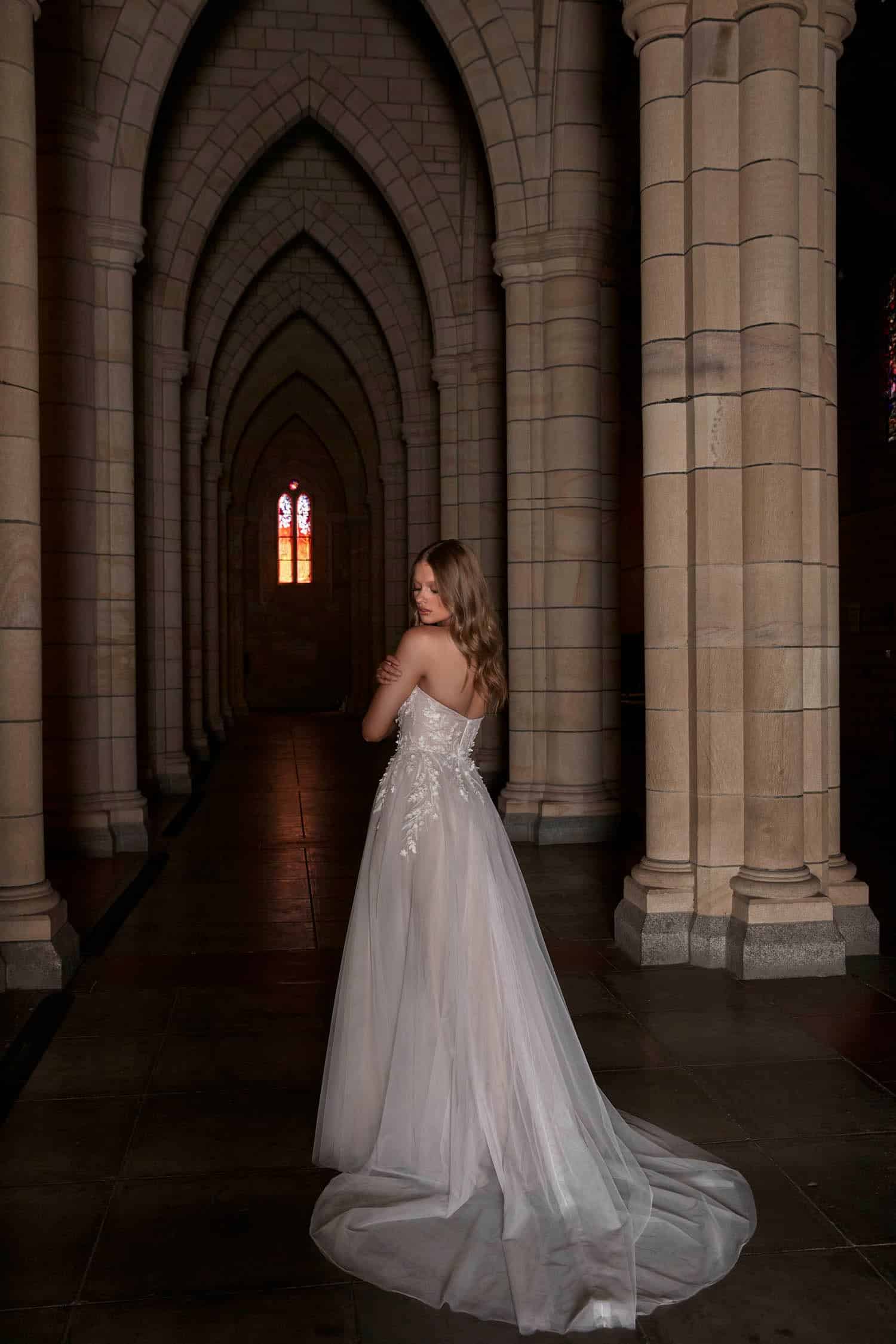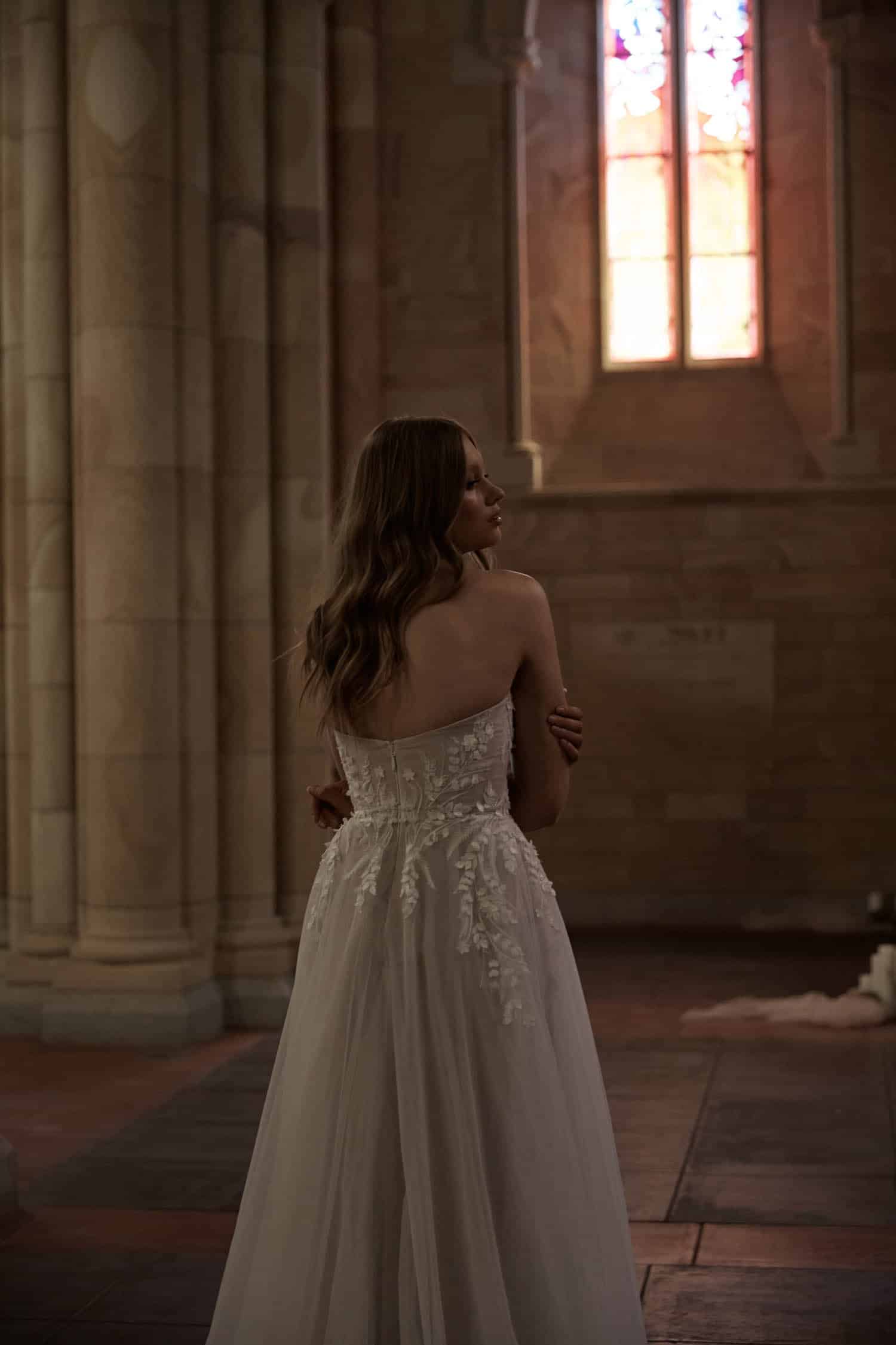 Tilda ist sehr feminin und zart und bezaubert mit der A-Linien-Silhouette und dem trägerlosen, herzförmigen Ausschnitt. Mit den gestickten Spitzenmotiven, die ein mikrozartes Chiffonblatt zieren, zieht es den Blick auf die Taille. Wogende Tüllschichten verleihen Tilda einen Rock voller Leichtigkeit und Bewegung und machen es zum ultimativen Kleid für Bräute, die sich einen ätherisch-romantischen Look wünschen.