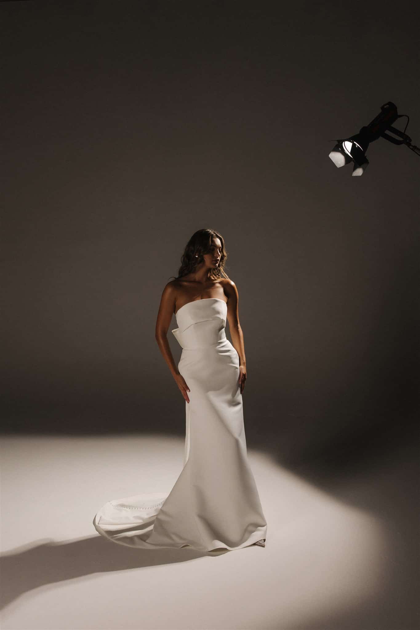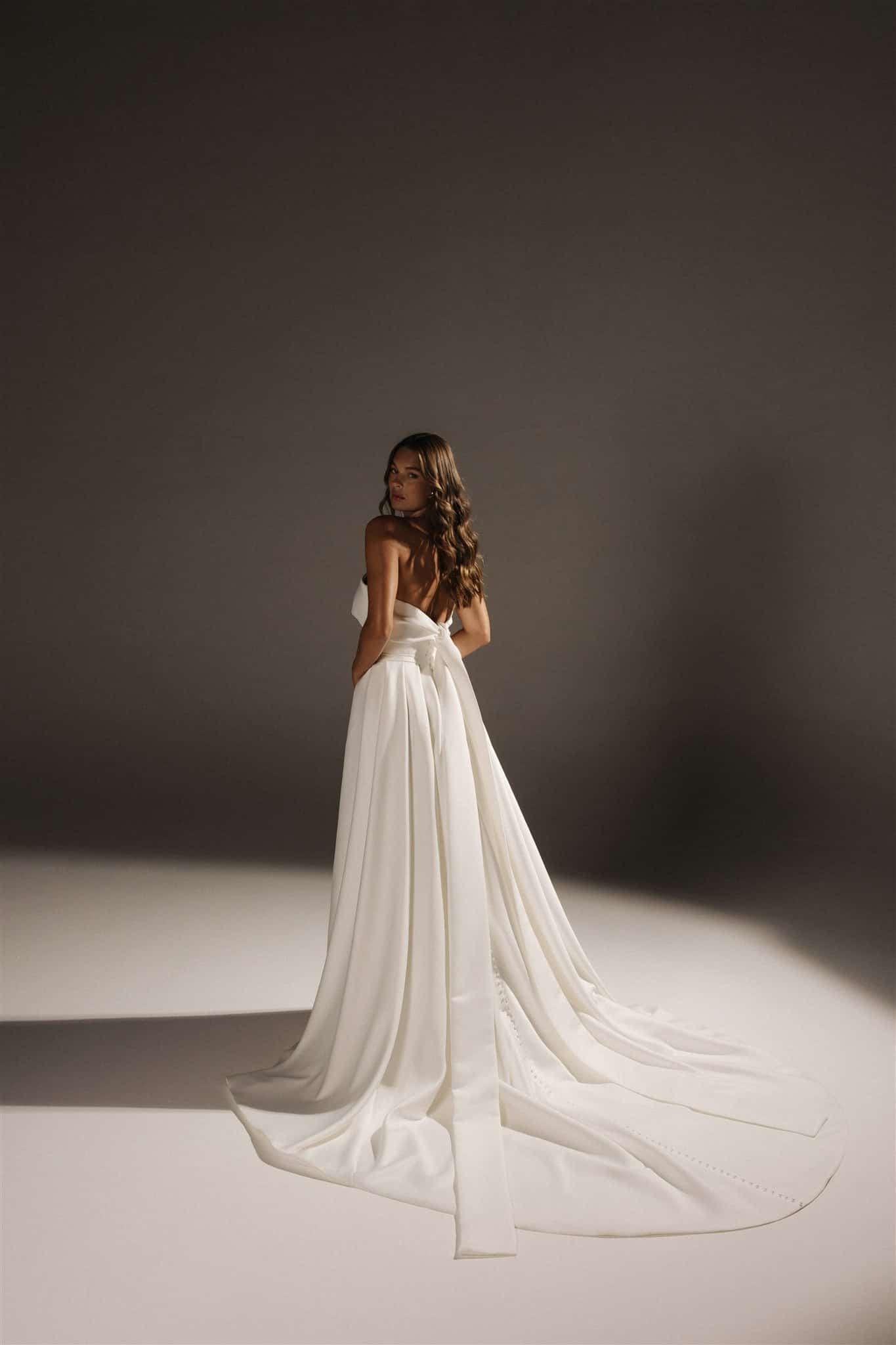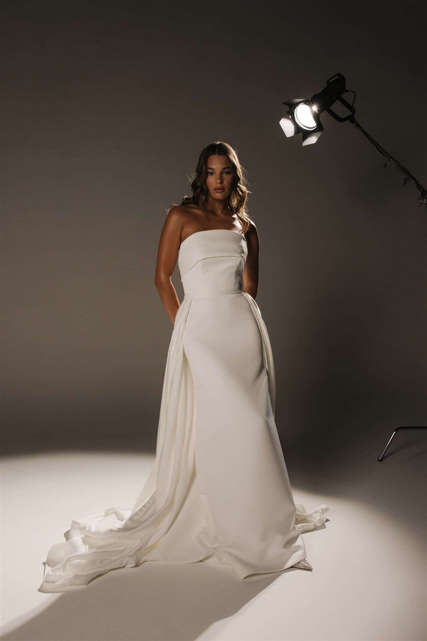 Fühle dich wie eine Königin im atemberaubenden Vincent-Kleid. Der doppelte Duchess-Satin fühlt sich üppig an und glänzt mit genau dem richtigen Maß an Glanz. Ein raffiniert gestalteter, nahtlos geschwungener Ausschnitt geht über der Brust in eine üppige Schleife am Rücken über. Die taillierte Silhouette ist schlicht und sexy, während ein passender, abnehmbarer Überrock mit klassischen Kellerfalten für einen majestätischen zweiten Look hinzugefügt werden kann.
