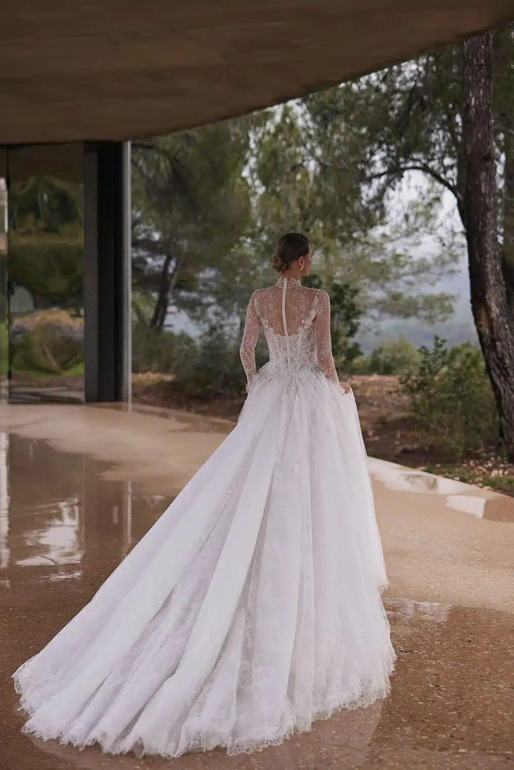 Visage-Kleid – ein halbtransparentes, detailreiches, korsettbasiertes Rollkragenkleid. Das Kleid hat eine A-Linien-Silhouette. Es wird hinten mit einem Reißverschluss geschlossen. Das Kleid ist aus zarter Spitze gefertigt und mit 3D-Blumen auf dem Korsett und dem Rock verziert. Die langen transparenten Ärmel, die mit zarten Spitzendetails verziert sind, strahlen Eleganz und Anmut aus und verleihen gleichzeitig einen Hauch von Bescheidenheit. Jeder Schritt ist eine Symphonie aus Schönheit und Anmut, während die Schleppe Ihrem Auftritt einen Hauch von Drama und Erhabenheit verleiht.